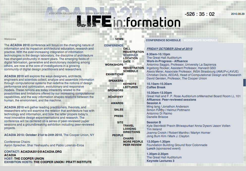 The brief of this 2010 Acadia conference is Life in Formation: On Responsive Information and Variations in Architecture, and it will discuss “on the influence of computing and its impact on the changing nature of information”. But at this point an interesting question should be answered. What is information? What is its specific significance in the area of information technology?