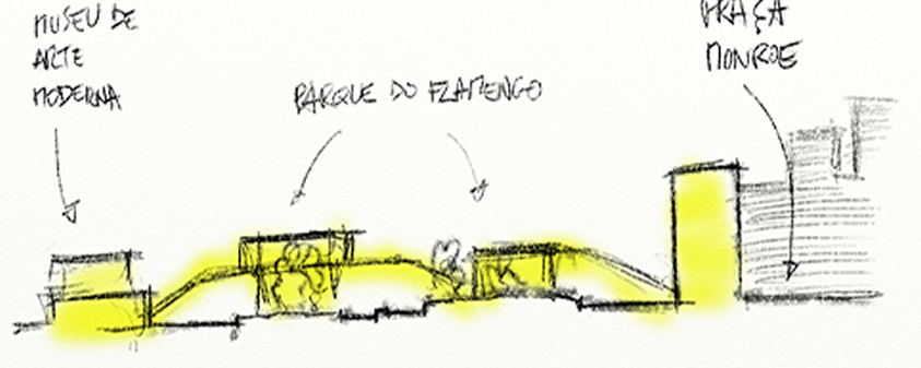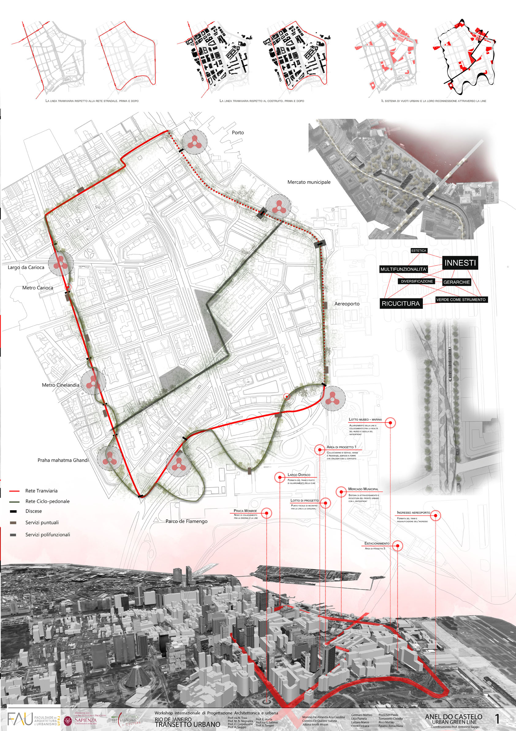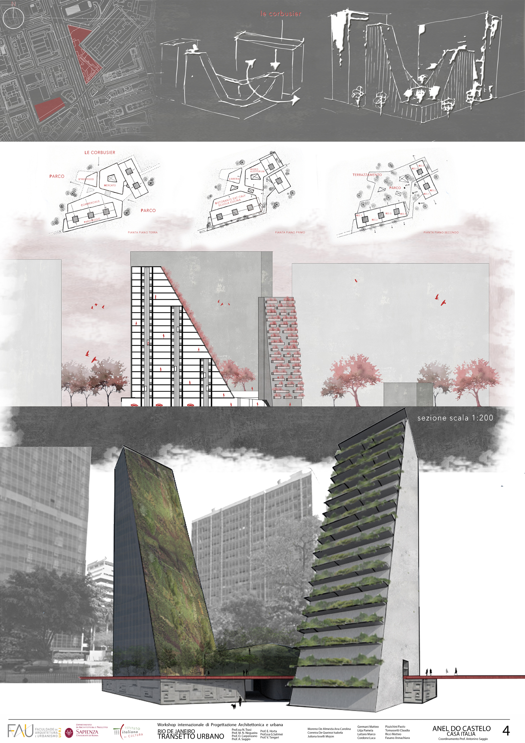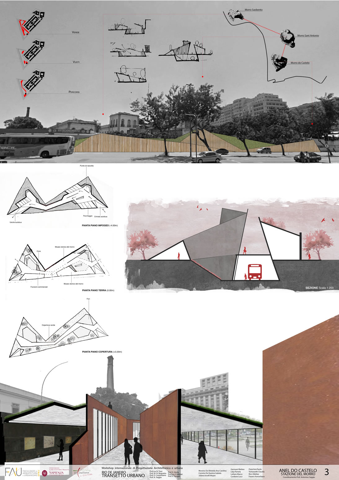 Come si vede il progetto si è sviluppato con una prima parte attraverso il disegno di un anello plurifunzionale "O Anel do Castel" che mette a sistema le molte situazioni che incontra nel suo percorso. Successivamente nascono due progetti basati sul Concetto di Mixitè e aderenti alle necessità riscontrate. In un caso è una stazione di autobus integreta ad altre funzioni sociali e pubbliche che si dispongopno anche attraverso lo scavo sotto la quota zero per articolare spazi e relazioni; nell'altro caso si tratta di Casa Italia, un complesso residenziale, di cui c'è richiesta per reinvigorire la residenzialità nel centro, che si innesta su un basamento pubblico articolato in spazi chiusi e aperti a cui si pensa di dare la funzione di centro gastronomico italiano a Rio.