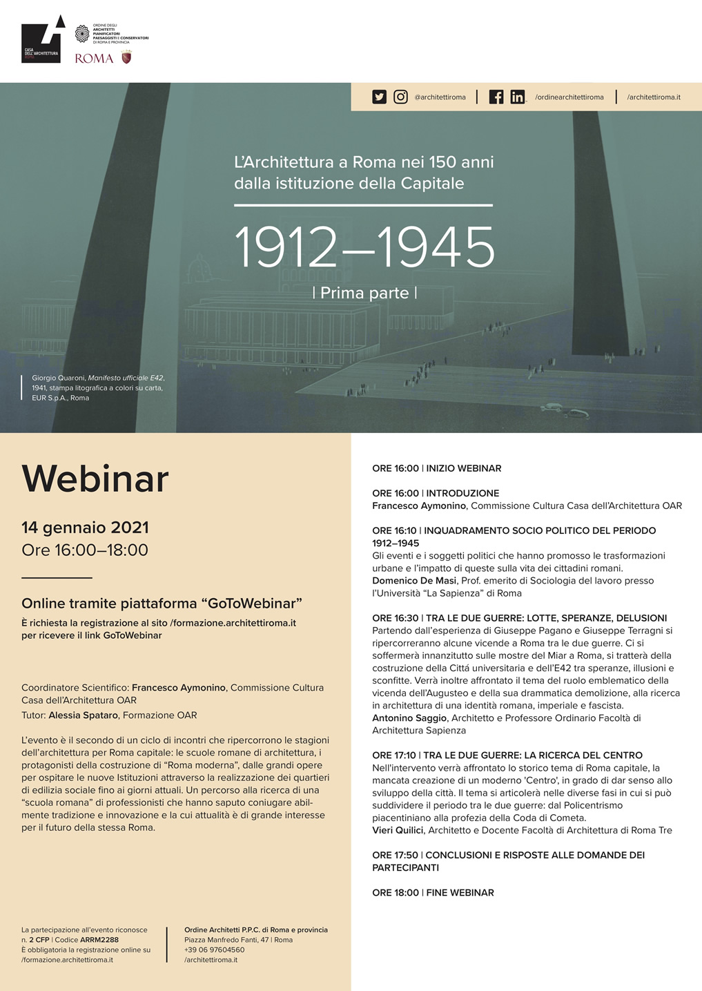 Partendo dall’esperienza di Giuseppe Pagano e Giuseppe Terragni si ripercorreranno alcune vicende a Roma tra le due guerre. Ci si soffermerà innanzitutto sulle mostre del Miar a Roma, si tratterà della costruzione della Cittaà universitaria e dell’E42 tra speranze, illusioni e sconfitte. Verrà inoltre affrontato il ruolo emblematico della vicenda dell’Augusteo e della sua drammatica demolizione, alla ricerca in architettura di una identità romana, imperiale e fascista.