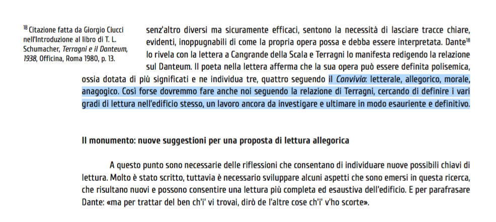 seguendo il Convivio: "letterale, allegorico, morale, anagogico. Così forse dovremmo fare anche noi seguendo la relazione di Terragni, cercando di definire i vari gradi di lettura nell’edificio stesso, un lavoro ancora da investigare e ultimare in modo esauriente e definitivo. "