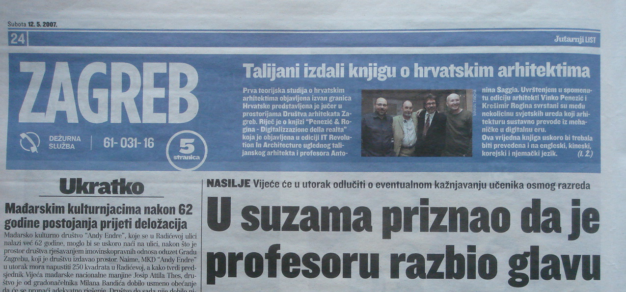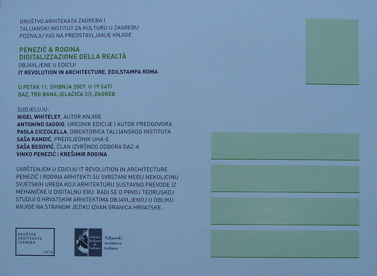Presentation of the book "Penezic&Rogina, digitalizzazione della realtà" It revolution in Architecture, Edilstampa Rome 2007. at Association of Architects of Croatia DAZ, present Author Nigel Whiteley, Antonino Saggio, Paola Cicconella, Sasa Randic, Sasa Begovic, Vinko Penezic & Kresmir Rogina.