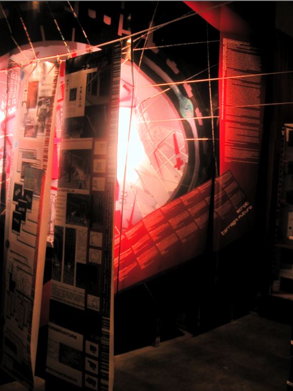 L'installazione alla Leopolda di Firenze in parte ripropone e in parte reinventa le spazialità e i contenuti della Mostra "Terragni Futuro" proposta per la Casa dell'Architettura di Roma. Sul ballatoio del primo piano dell'affascinante ex Stazione ferroviaria fiorentina è appesa una grande mappa che riassume il progetto generale di allestimento, le localizzazioni e gli indirizzi web di ciascuna delle 25 installazioni. Lo spazio espositivo è caratterizzato da questo pannello di tre metridi altezza per quattro di lunghezza e da un secondo ambito dove, su velari visibili dall'intera stazione, è proiettato un film con il lavori degli studenti e una breve introduzione a Terragni. Il percorso espositivo è cararatterizzato da bande di disegni appesi a fili da bucatoe da alcuni plastici critici. Il pubblico si sposta traqueste bande , analizza le diverse proposte e, immergendosi nello spazio, diventa attore della scena.