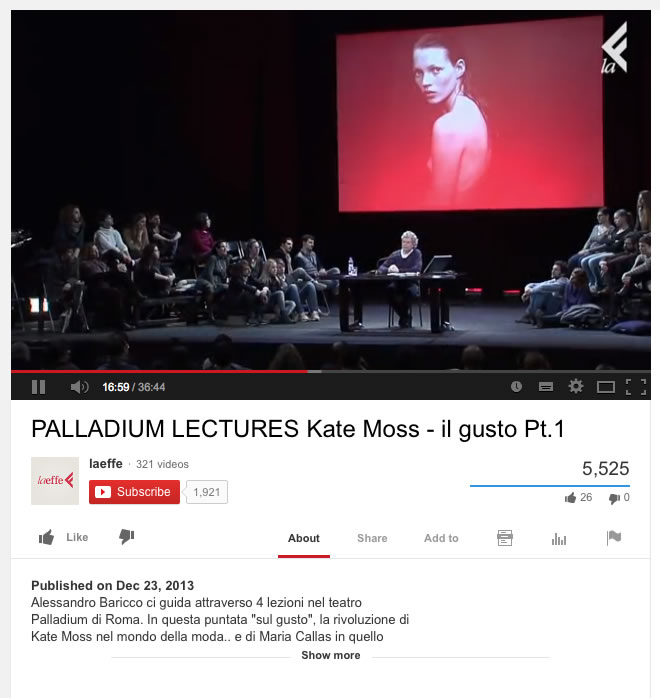 trova delle sintonia tra il tema della lezione e questa conferenza di A. Baricco che tratta del repentino cambio del gusto "lo strappo" come una cosa che prima non vedevamo come bella e possibile dopo lo strappo improvvisamente lo diventa. Baricco Puntualizza anche alcuni caratteri di questi strappi repentini. "Sono apparentemente illogici.. tutti li trovano pericolosi.. fanno impovvisamente apparire il prima come fosse preistoria .. e i protagonisti come dinosauri..."