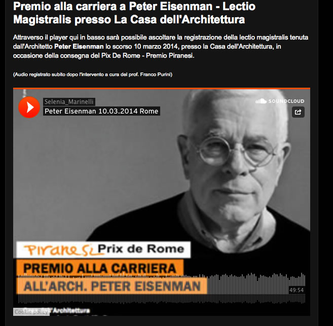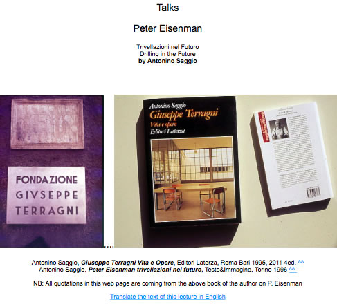 Marta Gioffrè ITCAAD 2014 discute dell'articolo..che è stato pubblicato originariamente nel lontano 1993 su Domus : Antonino Saggio, recensione a Peter Eisenman, di Pippo Ciorra, in "Domus", n. 751, luglio-agosto 1993, pp. I-II. La questioone è almeno per me rilevante. Infatti a chi legge l'articolo dopo il libro (del 1996) scoprirà che spesso i miei articoli contengono in nuce un libro. In moltissimi casi non l'ho scritto "dopo" il libro, nel caso di Eisenman si.