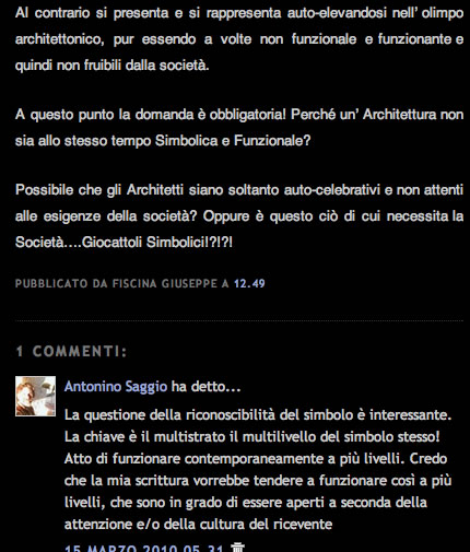 nel suo elaborato commento alla fine scopro che il filosofo Carlo Sini (v), ha letto con interesse Introduzione alla Rivoluzione Informatica in Architettura (in particolare i capitoli sull'interattività) e forse prima anche questi due scritti del 1998 e del 2000 o forse questo su Architectural Design? che avevano anticipato l'impatto. Adesso è presto per parlarne nel corso.. ci si arriva alla fine,,,