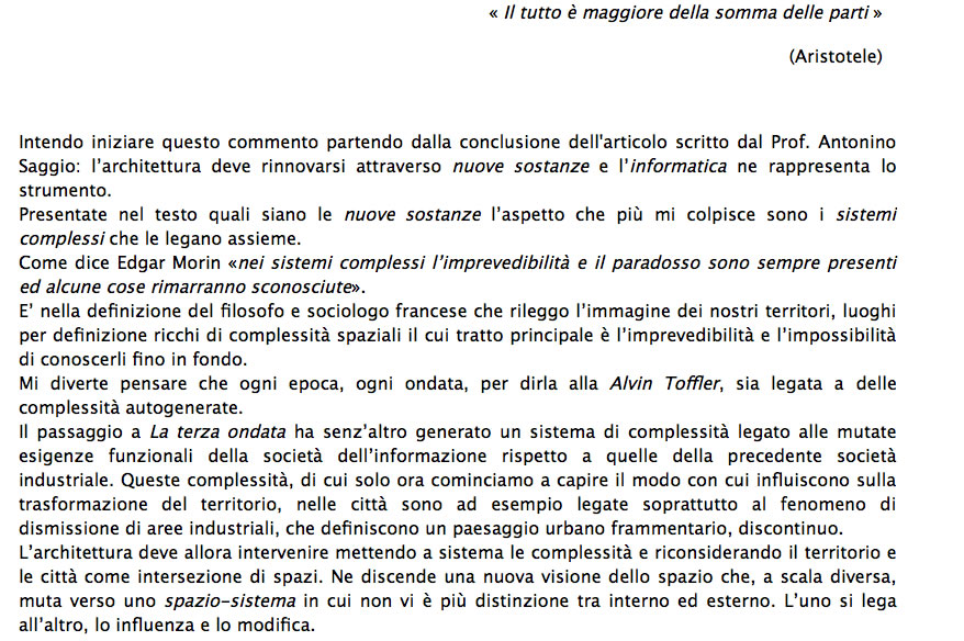 A. Leggi Nuove Sostanze. Manifesto della rivoluzione informatica (ovvero se preferisci il capitolo Sostanze e, o la prima parte del volume sino a pag. 50 "Questioni di contenuto nel volume Introduzione alla rivoluzione informatica in architettura)