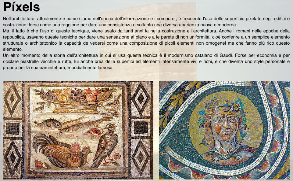 Fa riflettere sulla tecnica del mosaico in ambito di pixelazzione.Durante la discussione si fa trovare come mai ci si è soffermati su questo punto. Questo fa venire che con la tecnica di Leonardo con l'RGB per il colore si poteva riferirsi a contenitori di tessere nelle diverse localizzozioni. Gabriele Stancato fa notare la differenza tra la Griglia ortogonale dello schermo e quella Anche ondulata dei mosaicihttps://guillemorograu9.wixsite.com/