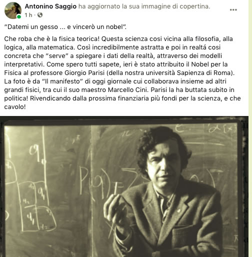 b: prof. Valerio Perna alunno 2014: Sì, la ricerca di Parisi è fantastica. La sua modellizzazione di sistemi complessi e disordinati/caotici è veramente straordinaria. Oltretutto, questo Nobel conferma anche la possibilità di rispondere ad una dicotomia presente nel concetto stesso di complessità. Se cercassimo solamente una modellizzazione descrittiva/predittiva, andremmo contro il concetto stesso di complessità a causa di una errata concezione dell'idea di modello visto come strumento rigido e 'non-elastico'. La chiave è una 'modellizzazione in-formed' (come ci ha detto anche Lei sin dall'inizio) in grado di carpire le interrelazioni senza cristallizzarle ma estrarne informazioni aventi senso. Del resto... la sua ricerca è stata usata come base per le reti neurali e il funzionamento del cervello umana dove i fattori sono infiniti e, tanto più, le loro interconnessioni sia stabilite che cortocircuiti casuali ed emergenti.
