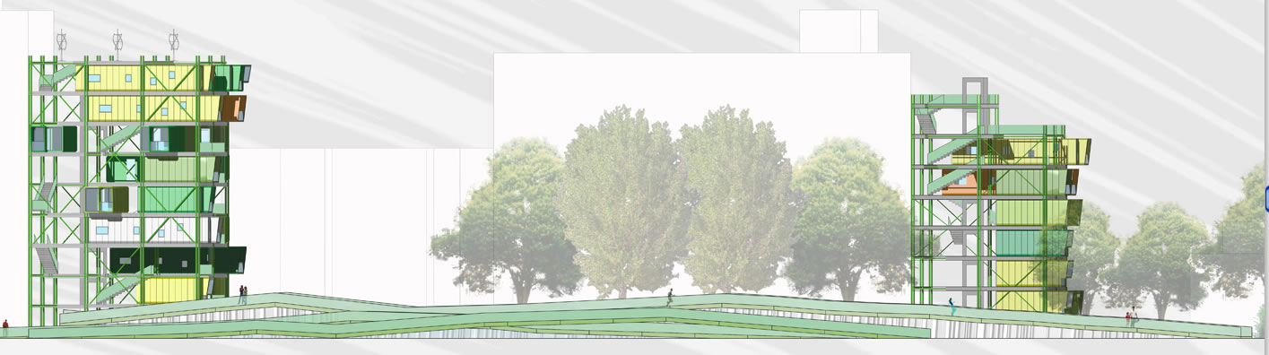 F5. FOTOMONTAGGIO del progetto nell'area di URBAN VOIDS realizzato con grande cura. Disegno chiave fondamentale dell'intera presentazione.