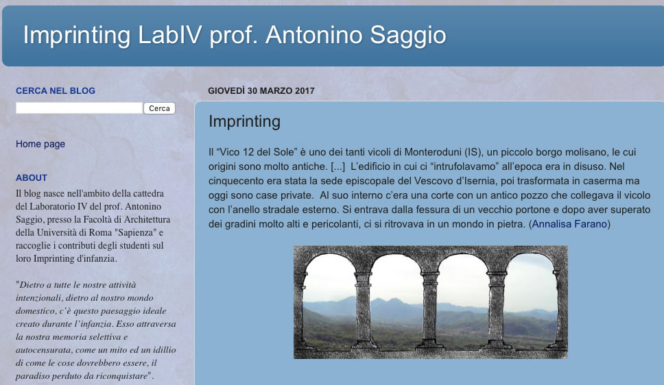 Antonino Saggio ha parlato in diverse occasioni e ha scritto del concetto di Imprintingsotto una lista di articoli. Sulla città di Roma una conferenza è "Roma interttotta" con video