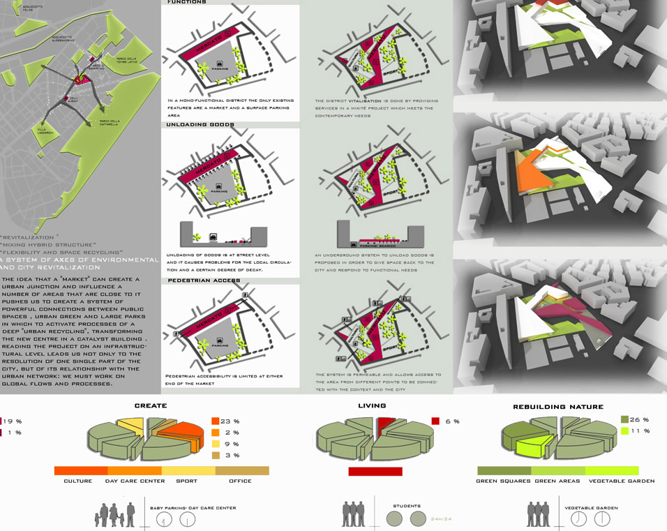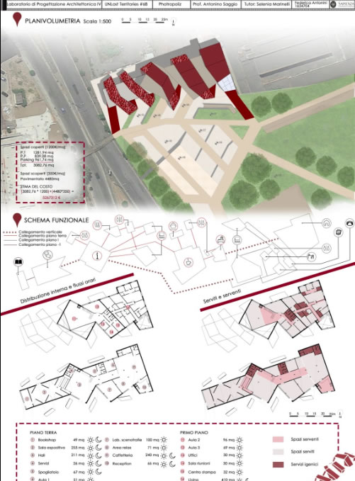 E' importante capire che la presentazione è tematica...cioè ogni capitolo che contiene un argomento ha un titolo e le scelte dei grafici ruotano su quel titolo-argomento. questo modo di presentare-raccontare il progetto esclude quindi Tavole organizzate semplicemnete sugli elaborati grafici o sulle scale grafiche ma al contrario anche le tavole di tipo architettonico individuano "UN TITOLO TEMA" (la piazza, il percoso, le terrazze, le spazialità le aree di trnsizione, l'immagine eccterea) e fanno ruotare sul quel tema i grafici più rappresentativi. Per esempio Rendering Piante, sezioni, sezioni prospettiche, assonometrie eccetera.