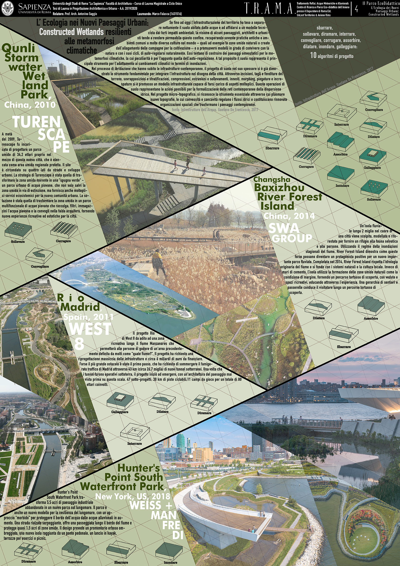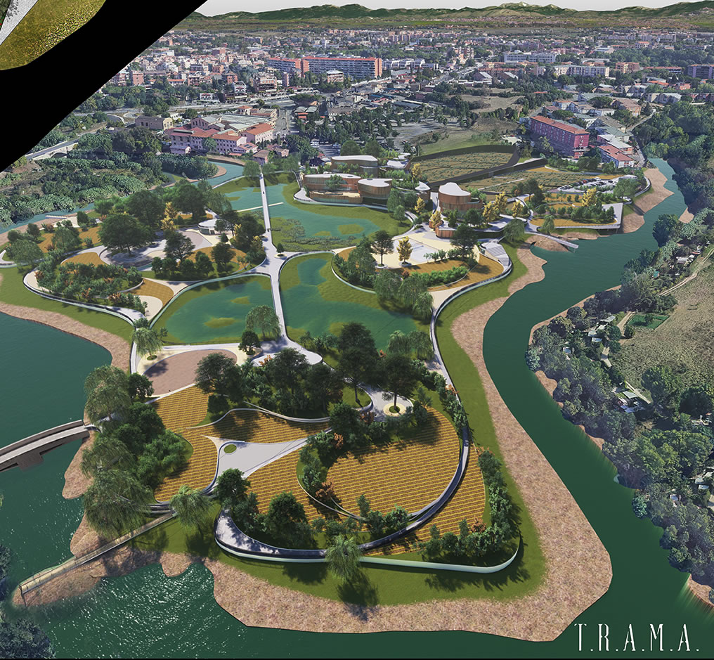 T.R.A.M.A. è quindi progetto ambizioso che aspira a recuperare in termini urbani, architettonici, ecologici e sociali l’ansa generata dall’andamento del fiume Aniene nel suo tratto urbano all’altezza di Ponte Mammolo, nel quadrante Est della città di Roma. Il parco eco-didattico è stato disegnato in funzione dell’innalzamento delle acque in occasione di ingenti fenomeni di precipitazione, in modo da gestire e di ridurre il carico idrico delle piene alluvionali. Il progetto inoltre favorisce lo smaltimento sostenibile nonché il recupero dei fanghi provenienti dal vicino Depuratore gestito dall’Acea, grazie all’integrazione con tecniche depurative naturali quali la fitodisidratazione dei fanghi e la laminazione delle acque meteoriche. Il parco infatti prevede due grandi bacini di ritenzione idrica, in grado di assorbire il fenomeno delle bombe d’acqua e quello delle piene alluvionali ad esso collegate.