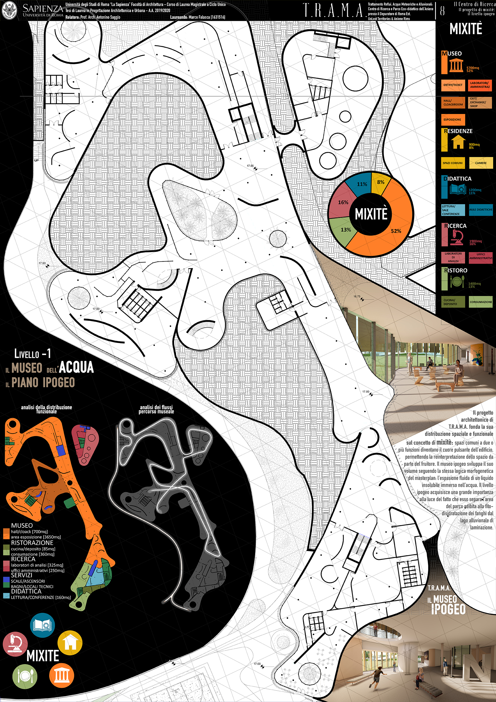 Una parte di città soggetta ad innumerevoli criticità (la marginalità e segregazione del fiume Aniene rispetto al contesto urbano, la presenza di un depuratore delle acque che necessita di un miglioramento del trattamento dei reflui, le inondazioni sempre più frequenti negli ultimi anni) vengono affrontate nel progetto T.R.A.M.A. con una serie di mosse coerenti e tra loro sinergiche. Da una parte si crea un paesaggio dell'acqua, in sintonia con ormai mature e numerose esperienze internazionali progettato con tecniche naturali che assecondano i flussi dell'acqua anziché ostacolarli, dall'altra si disegnano spazi aperti e un complesso architettonico adatto alla valorizzazione dell'insieme. Si crea così anche a Roma un Eco-parco che è contemporaneamente un centro didattico e museale che valorizza una significativa ansa del fiume Aniene.