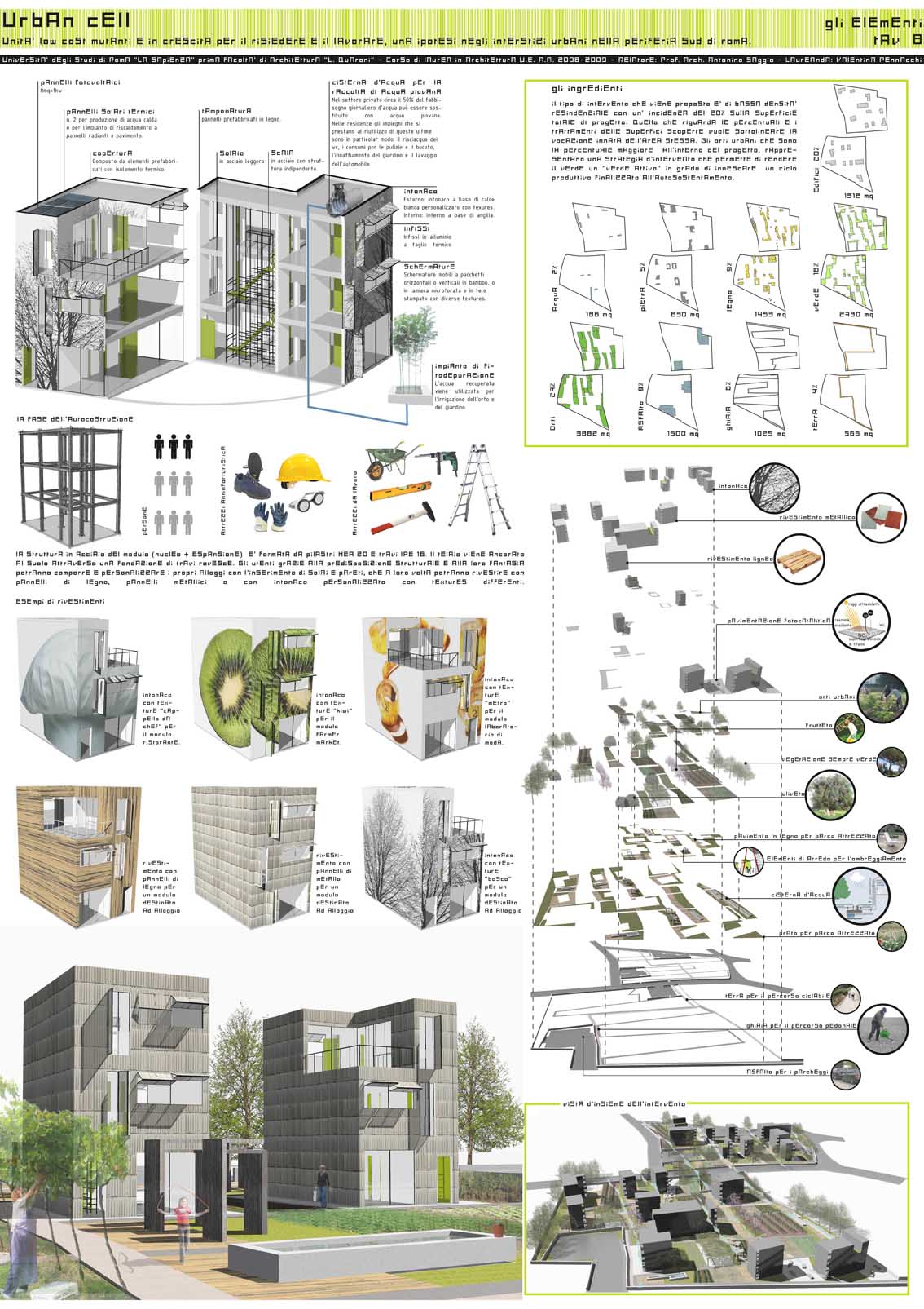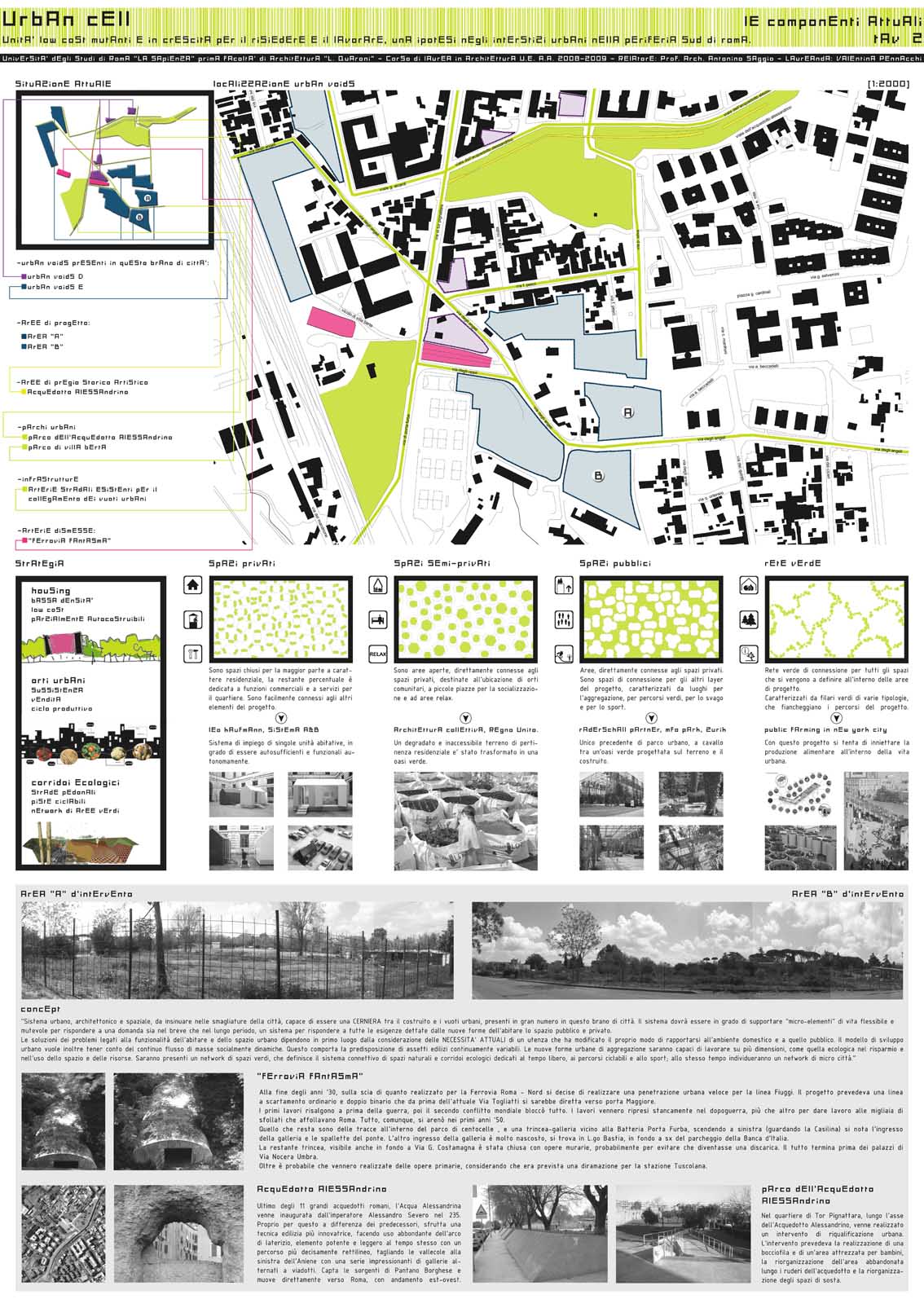 Come operare con progetti a bassa densità in aree urbane marginali ma sottoposte a spinte edificatorie e speculative? La strategia proposta in questo caso propone un insediamento di caratteristica semirurale con abitazioni parizalmente autocostruite e con crescita programmata nel tempo. Si tratta di una strategia che permette di creare insediamenti a basso costo per giovani o nuovi immigrati che conservano e anzi valorizzano il verde interstiziale: un bene prezioso e da difendere della città di Roma.