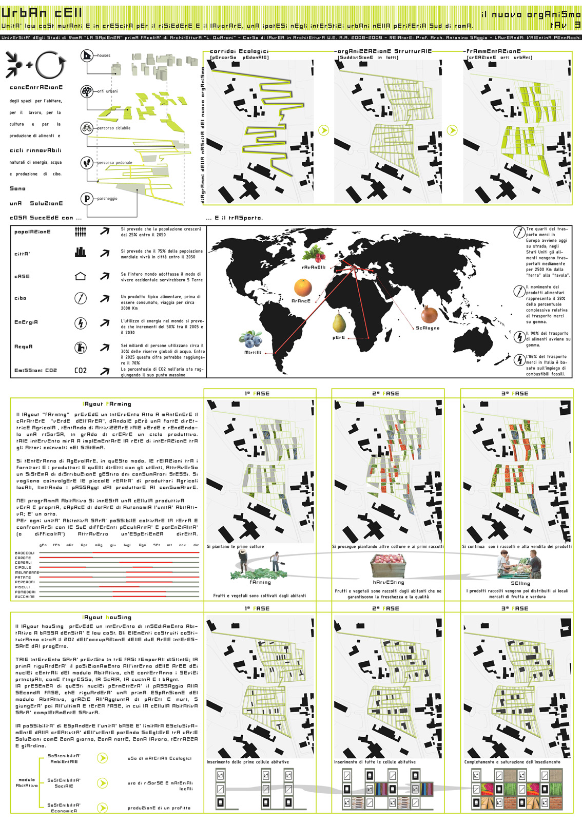 Le nuove forme urbane saranno capaci di lavorare su più dimensioni, come quella ecologica, nel risparmio e nell’uso dello spazio e delle risorse, sarà presente un network di spazi verdi, che definirà il sistema connettivo di spazi naturali e corridoi ecologici dedicati al tempo libero, ai percorsi ciclabili, allo sport. Contemporaneamente tali sistemi urbani saranno in grado di attivare un ciclo produttivo, grazie all’inserimento nell’area di numerosi orti urbani, capaci di porre rimedio seppur a livello locale, alle storture del sistema delle metropoli, contribuendo al recupero di aree abbandonate e degradate, educando a pratiche ambientali sostenibili, offrendo un punto di incontro e socializzazione per la comunità, indicando un’alternativa alle categorie emarginate dalla società moderna, infine "rallentando" i ritmi della società contemporanea.