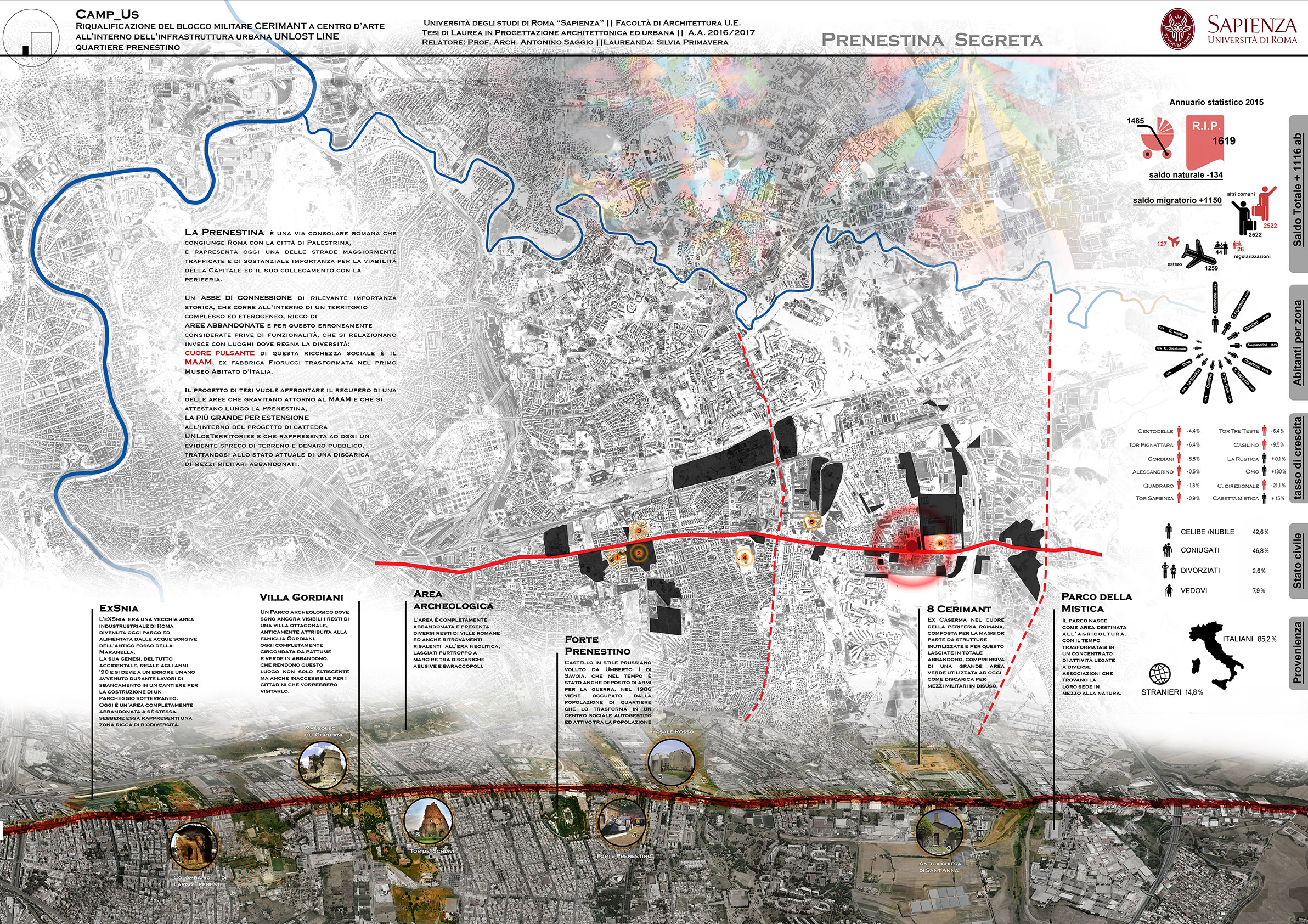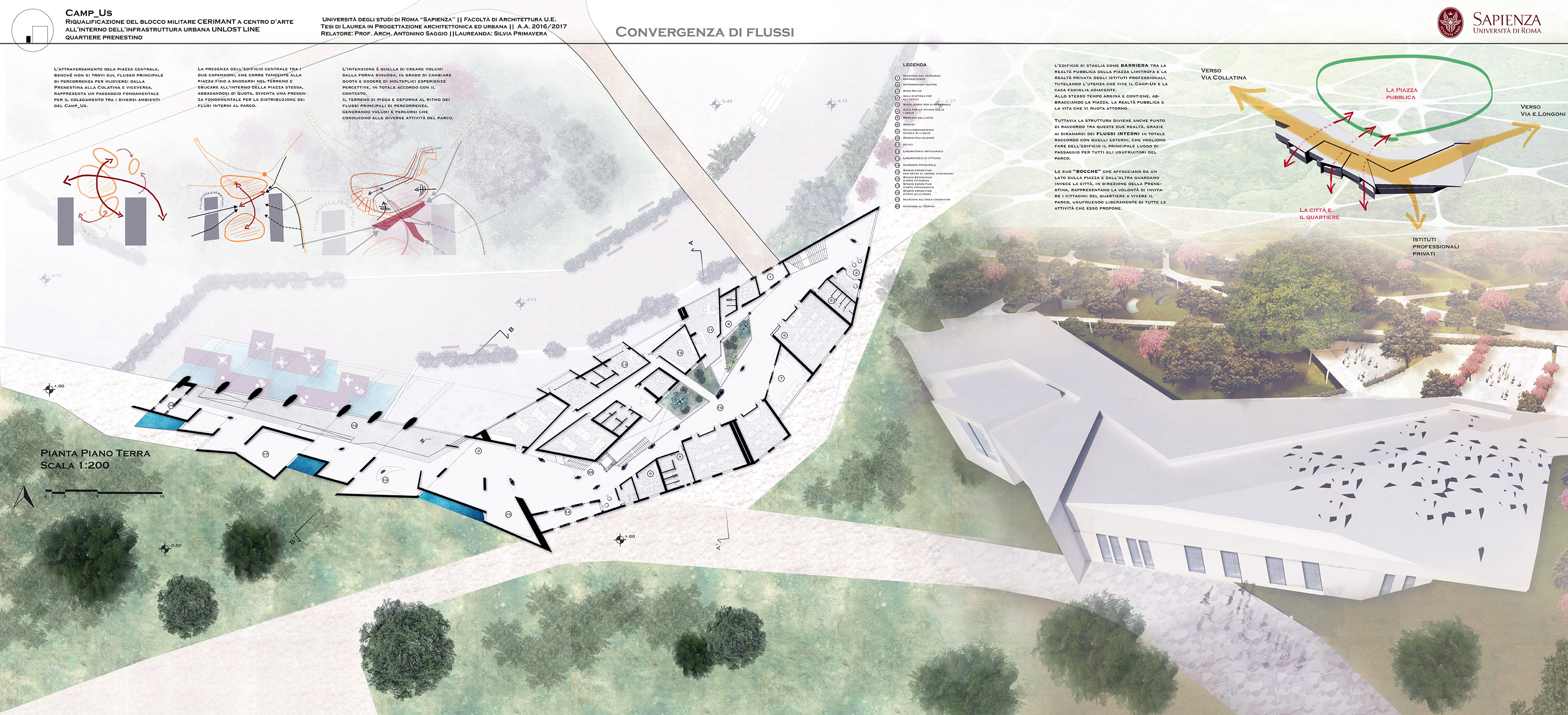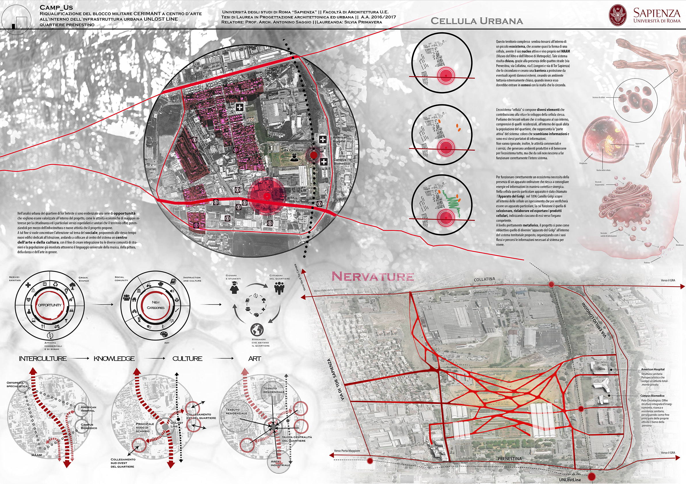 L’area di studio, collocata in una posizione strategica per la vicinanza con il MAAM e le sue attività strettamente legate all’arte e all’incontro con “il diverso”, diventa fondamentale per ricollegare la vicina Via Prenestina, posta a Sud, con la Via Collatina a nord, con la creazione di un raccordo pedonale e ciclabile con l’infrastruttura di nuova generazione ed il trasporto su gomma. CAMP_US trasforma l’ExCerimant da barriera impenetrabile in fondamentale passaggio tra le diverse parti del quartiere, attraverso un sistema di flussi che innervano il vecchio presidio militare in ambiti naturalistici dedicati allo sport, alla salute, all’istruzione e all’arte, un parco che, al pari di una cellula, dona nuova linfa ad un territorio che rischia di soccombere a causa della mancanza di un elemento ordinatore capace di organizzare virtuosamente le diverse realtà urbane presenti. Tale processo non coinvolge solo le realtà limitrofe, ma anche diverse preesistenze interne all’area di progetto, in particolare due capannoni dismessi, di possibile attribuzione all’Ex scuola Nervi, e che si fanno qui incubatori di un programma di mixitè, che accoglie attività didattiche di carattere professionale dedicate all’enogastronomia e alla sanità. In tal modo CAMP_US si propone non solo come supporto logistico ed economico ai principali enti sanitari locali, ma offre importanti opportunità di integrazione a quelle realtà sociali meno fortunate, tramite la realizzazione di una casa famiglia di nuova generazione, che vuole dare ai ragazzi l’opportunità di formarsi a livello professionale e costruirsi in questo modo le basi per affrontare un futuro ricco di molteplici possibilità. A questo si aggiungono anche spazi destinati al progetto Dynamo Camp, un camp di Terapia Ricreativa, primo in Italia, appositamente strutturato per ospitare gratuitamente e per periodi di vacanza e svago bambini e ragazzi malati, in terapia o nel periodo di post ospedalizzazione, e che attualmente non trova sede a Roma.