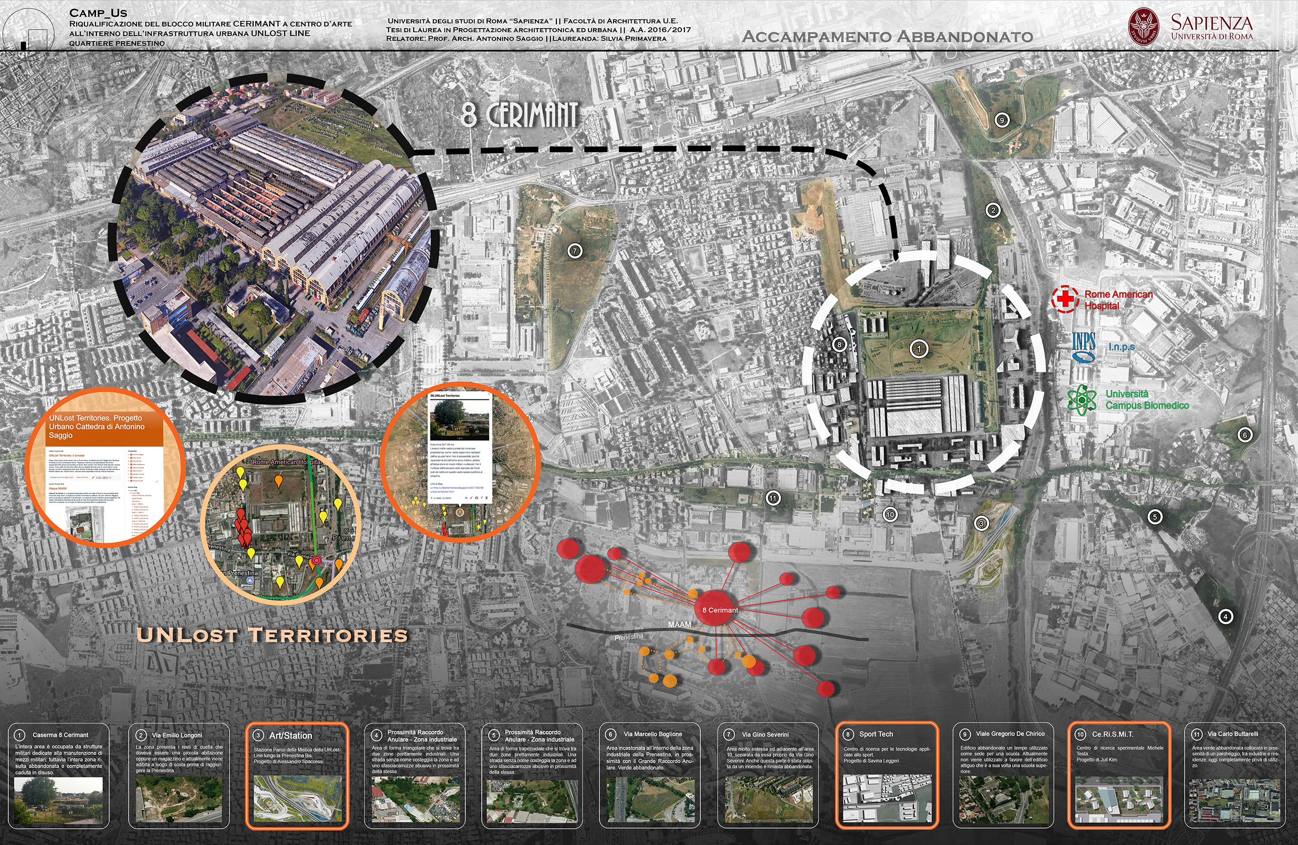 Per dare una risposta unitaria alla duplice crisi che attanaglia il Quartiere Prenestino, è necessaria un’azione sinergica che operi sia a livello infrastrutturale sia a livello sociale, ma anche economico: nasce così la UNLostline, che rigenera il vecchio tracciato ferroviario presente all’interno dell’area dell’Ex Cerimant. Si tratta di un anello infrastrutturale di nuova generazione, ecologico, che vuole ricucire i tre grandi parchi presenti all’interno del territorio di Roma Est (il Parco di Centocelle, il Parco dell’Aniene ed il Parco della Mistica) e riconnettere il brano di città a ridosso di Via Tiburtina con quello più a sud di Via Casilina, per andare a costituire al tempo stesso un vero e proprio raccordo tra le linee metropolitane di Roma. Strutturata in un attento cronoprogramma che porterebbe alla sua realizzazione nell’arco di dieci anni, la UNLostLine collega le diverse aree presenti all’interno del progetto UNLostTerritories, per creare un costante scambio di informazioni tra le diverse attività proposte nei progetti e creare connessioni tra il tessuto cittadino esistente e le nuove realtà che vanno pian piano a costruirsi, donandogli nuova vita. Il primo tratto prevede una fermata proprio all’interno dell'area descritta dalla ex caserma Cerimant, in virtù della presenza limitrofa di importanti strutture sanitarie a livello regionale, come il Campus Biomedico, specializzato in radiologia ed oncologia, con diverse strutture dedicate alla ricerca e ai laboratori di sperimentazione e l’American Hospital, una struttura sanitaria polispecialistica che ha adottato tecniche di avanguardia dal punto di vista tecnologico per la strumentazione diagnostica, la terapia medica e la chirurgia.