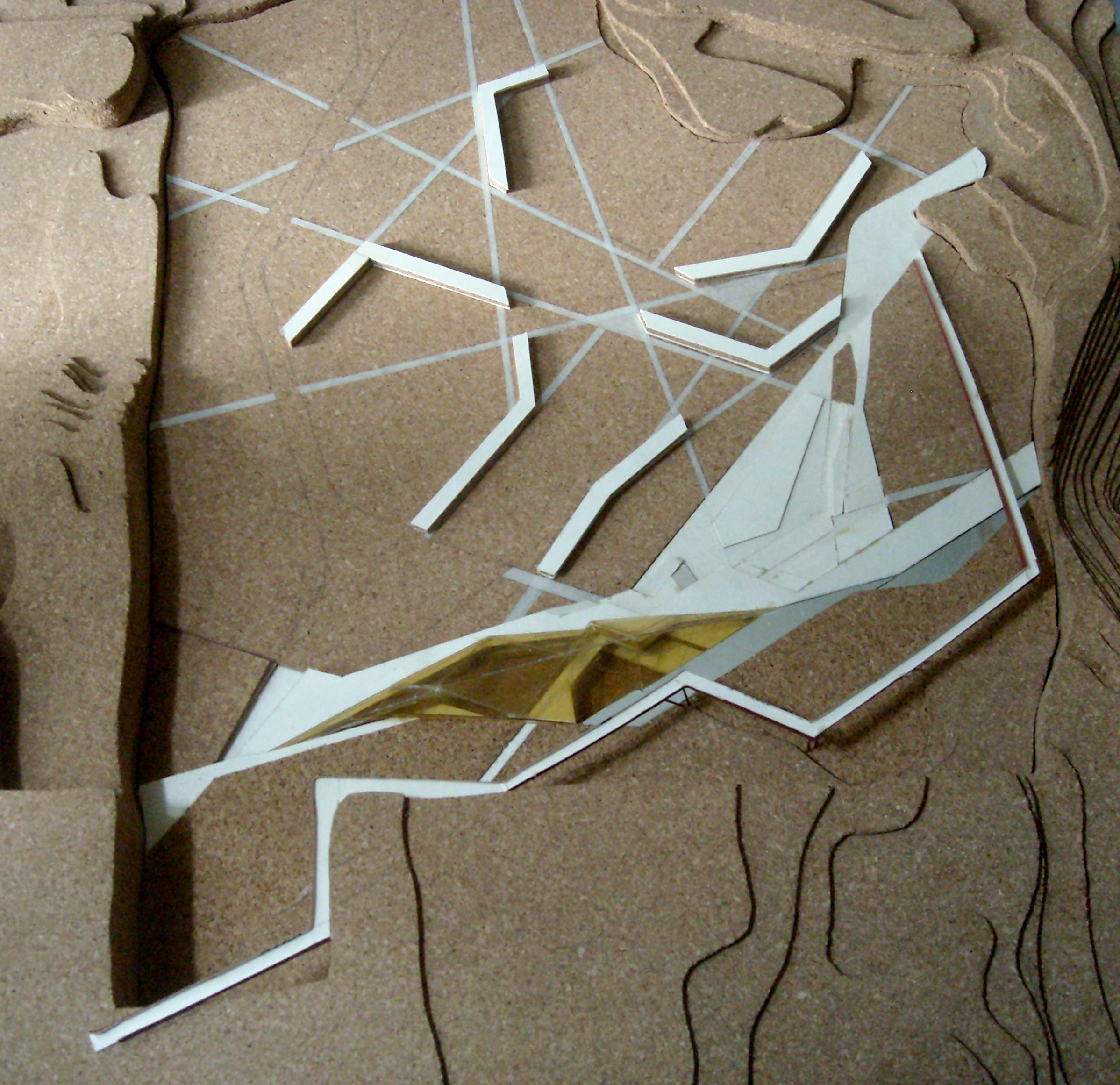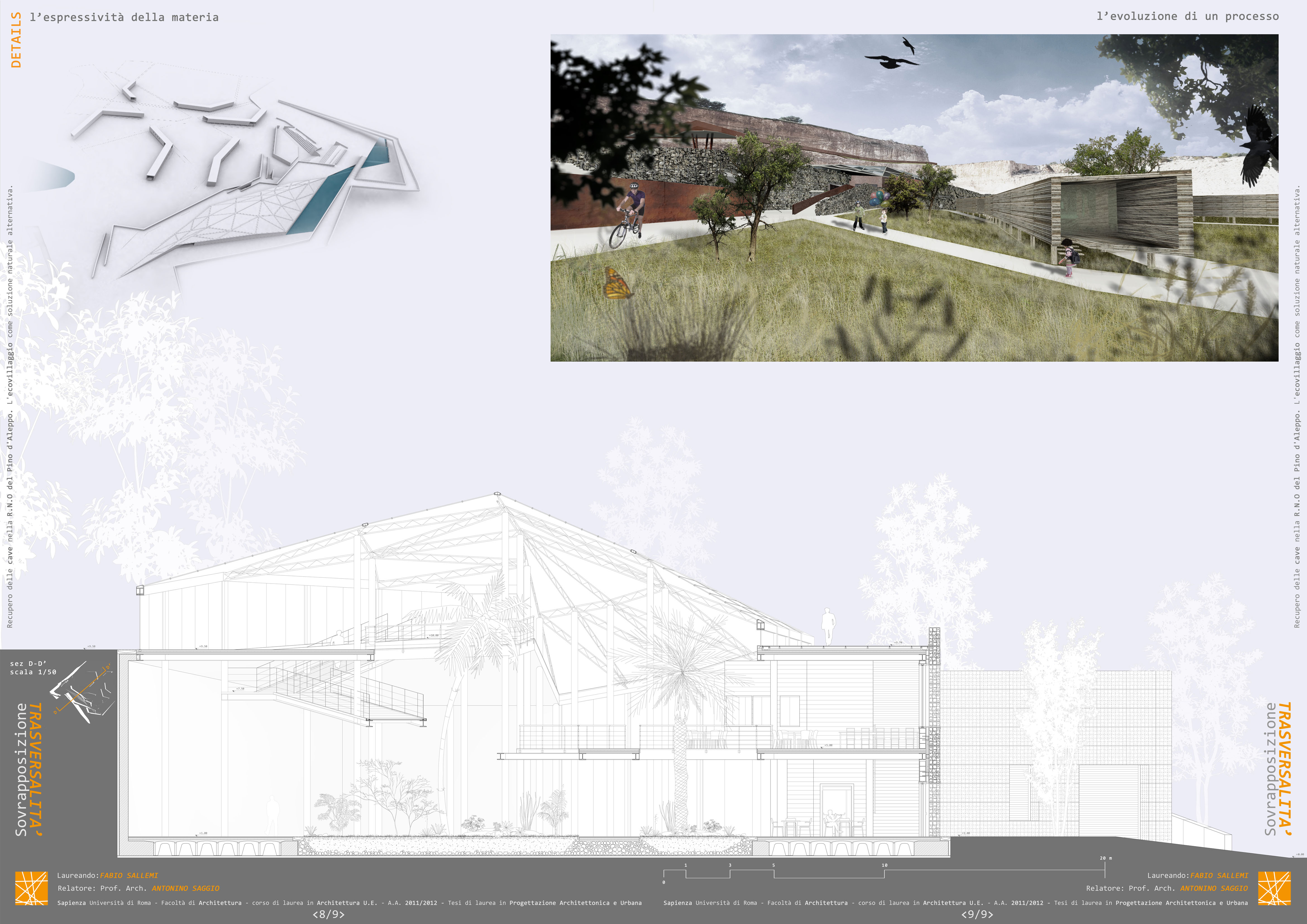 In una cava abbandonata, oggi ricettacolo di rifiuti e discarica di elettrodomestici si instaura un progetto riparatore. Riparatore perchè inserisce una nuova funzione educativa e di tutela ambientale, perchè innesta vitali attività economiche come una serra e servizi di ristorazione, riparatore perchè crea spazi di espisizione lungi i suoi percorsi sia esterni che interni, riparatore perchè determina un uso agricolo degli spazi circostanti e perche infine fa vibrare l'esistente con pochi segni minimali di architettura: le rampe-ponti che conducono dalla quota di accesso superiore alla cava nella parte bassa (quasi consentendo al visitatore di senire le pareti segate della montagna) e perchè attraverso una serie di corpi di architettura, zigzanati nel terreno come fenditure, si esalta la magica forza del luogo. Il tutto entro una riserva naturale e a ridosso della bella citta cardo decumanica di Vittoria, nella parte sud della Sicilia.