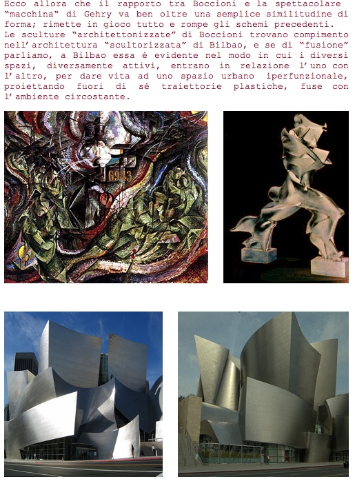 Quattro mesi prima, giugno 1997, avevo pubblicato il mio libro su Gehry in cui sviluppavo tutta la questione del raporto con Boccioni. Incredibilmente nelle migliaia di pagina su gehry, a quella data nessuno dico nessuna li aveva mai accostati.