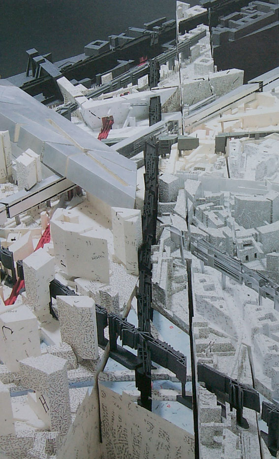 "Il progetto della Circumvesuviana prevede il restyling e la ristrutturazione delle stazioni di Pompei-Santuario e Villa dei Misteri, creando un collegamento tra la città antica a quella nuova. Questo progetto di Eisenman per Pompei mi è sembrato significativo, e ricco di tutti gli elementi della sua poetica legata alla ricerca di un dialogo con l'esistente attraverso la ricerca di giaciture e geometrie sulla base di mappe storiche e preesistenze, come tanti layer sovrapposti. Attraverso il plastico si denota l'insinuarsi del costruito tra le pieghe delll'esistente."