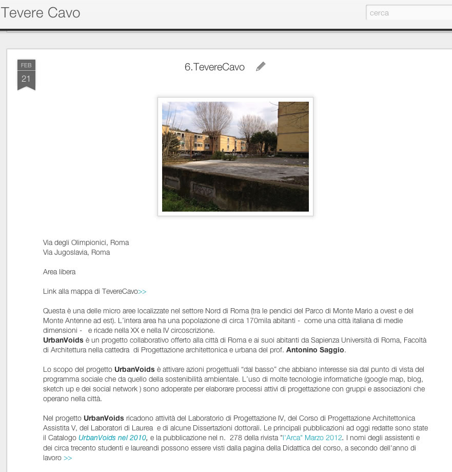 La Cattedra del prof. Antonino Saggio alla Facoltà di Architettura a "Sapienza" Università di Roma sta lavorando dal marzo 2012 ad un nuovo e impegnativo progetto urbano. Il progetto si chiama Tevere Cavo e riguarda il settore urbano della città che segue l’andamento del Tevere dalla diga di Castel Giubileo a Nord alla porta di Piazza del Popolo a Sud e che è racchiuso dai grandi colli di Monte Mario ad Ovest e di Monte Antenne ad Est. Il progetto Tevere Cavo continua metodologicamente la strategia degli Urban Voids ((vedi) ) che intendono valorizzare una serie di vuoti urbani e di aree sottoutilizzate e si ricollega al progetto urbano della Urban Green Line (presentato alla Casa dell‘Architettura di Roma nel marzo 2012 e sul fascicolo n. 278 de “l’Arca” vedi) che univa con un anello ecologico i due grandi parchi archeologici tra l’Appia e la via Casilina. Se nel caso della Urban Green Line una nuova linea tranviaria assumeva il ruolo di catalizzatore di una serie di intenti e scopi, in questa parte di Roma non può essere che il Tevere l’elemento sistemico. Un Tevere su cui scorre la storia stessa della città e forse il suo futuro. Al progetto Tevere Cavo partecipano il Laboratorio di Progettazione IV e il Corso di Progettazione Architettonica Assistita del Corso di laurea UE della Facoltà di Architettura, numerosi laureandi uniti in un laboratorio di laurea che sviluppano specifici progetti architettonici in questa parte della città e alcuni architetti dottorandi iscritti al Dottorato di ricerca in Architettura Teorie e Progetto del Dipartimento di Architettura e Progetto.