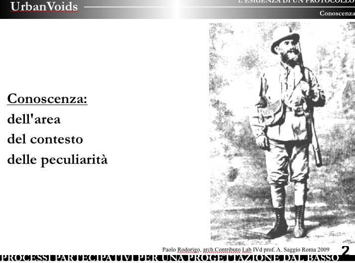Questa quarta declinazione "chimica" è associata per me al concetto di Imprinting: e cioè alla teoria che vede nelle fasi formative della vita la creazione di dei pattern, di delle strutture ricorrenti che poi continuano in tutta l'evoluzione successiva. Il concetto non è solo delle scienze naturali, biologiche, psicologiche, comportamentali ma è stato applicato anche in altri settori. E' una condizione primigenia, una infanzia mitica continuamente riproposta nella vita adulta anche se nelle forme imprevedibili dell'arte. ....Tutto lo sforzo di UrbanVoids, è esattamente far capire come Contesto è inevitabilmente contesto fisico e contesto sociale e che proprio nell'intreccio delle due componentiast la direzione dell'agire progettuale.
