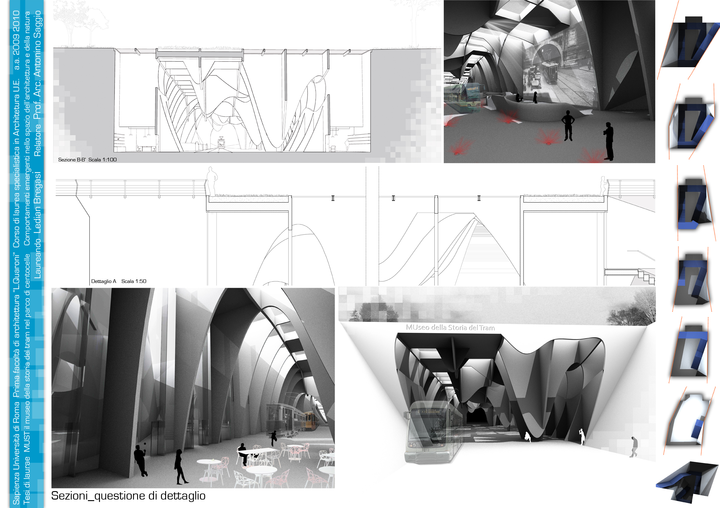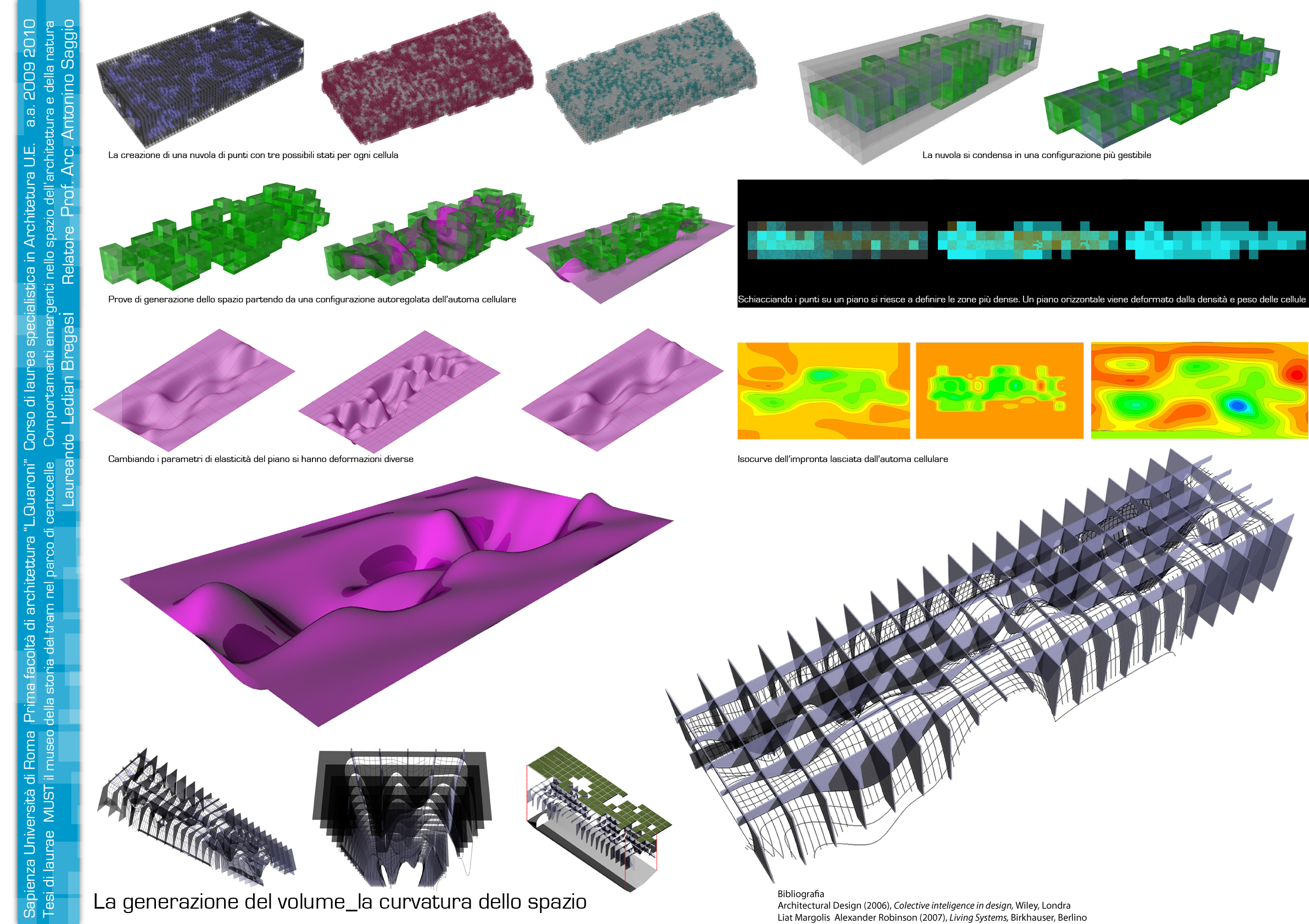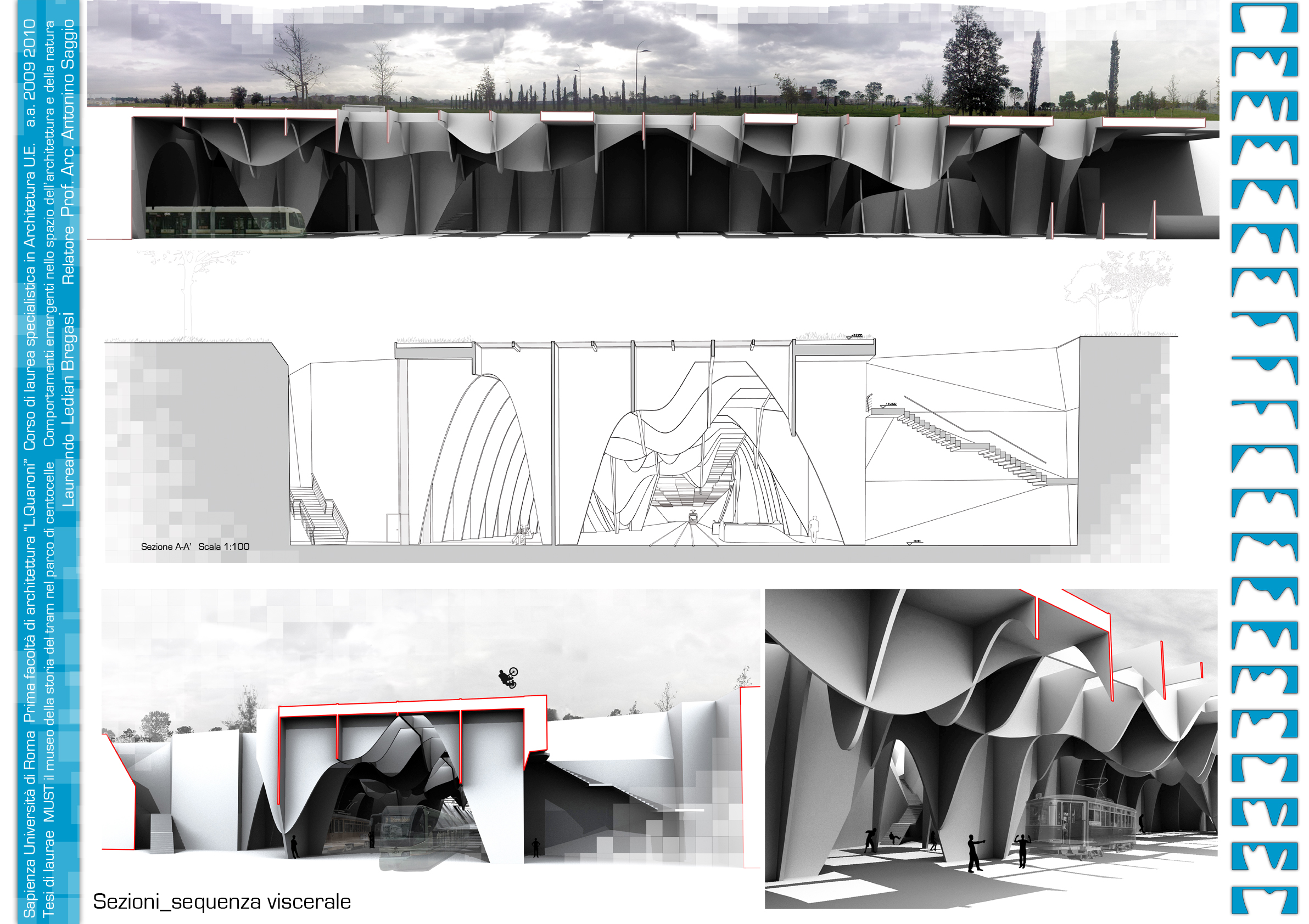 Lo spazio interno del Museo del Tram viene configurato con il principio del comportamento emergente dei sistemi complessi. Delle cellule che rappresentano funzioni diverse si collocano nello spazio generando una configurazione generata attraverso un algoritmo e imprevedibile nello stato iniziale. Questo sciame di cellule, seguendo solo quattro semplici regole, riesce a distribuirsi in una maniera che sarebbe impossibile da calcolare dalla singola cellula. La densità e il peso delle cellule deformano poi un piano orizzontale che una volta sezionato ogni cinque metri in ogni direzione, crea lo spazio interno del museo che, ricordando naturalmente processi orografici e naturali, a nostro avviso fornisce una interessante ambientazione per la funzione prevalente e allo stesso tempo garantisce la continuità del parco in superficie.
