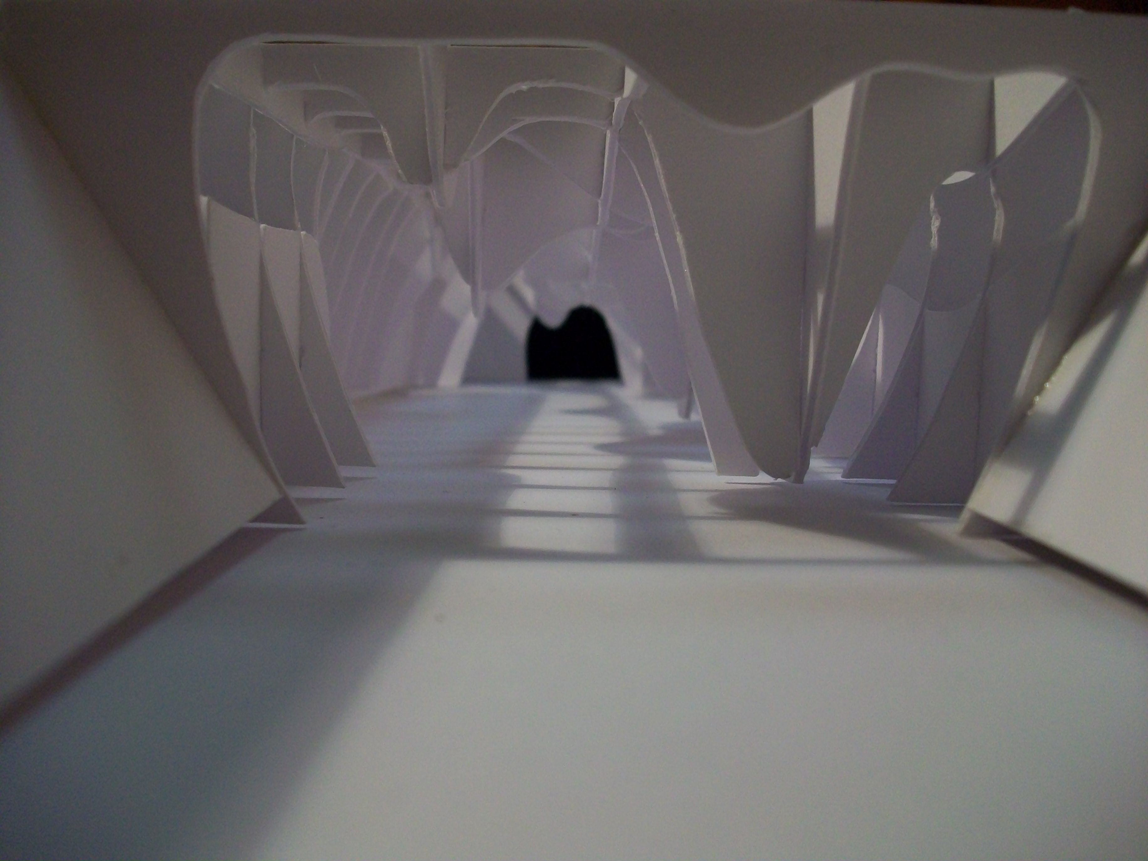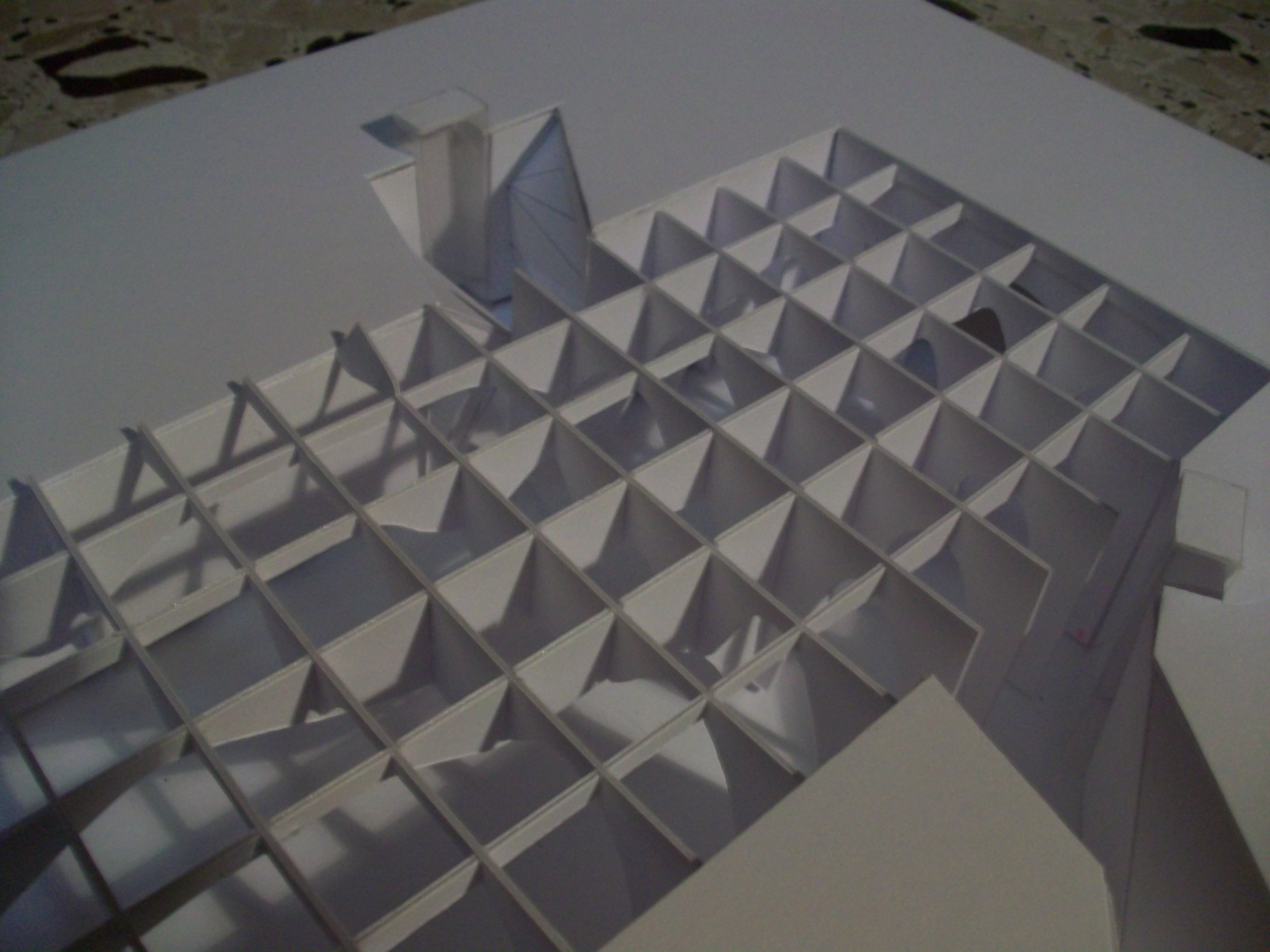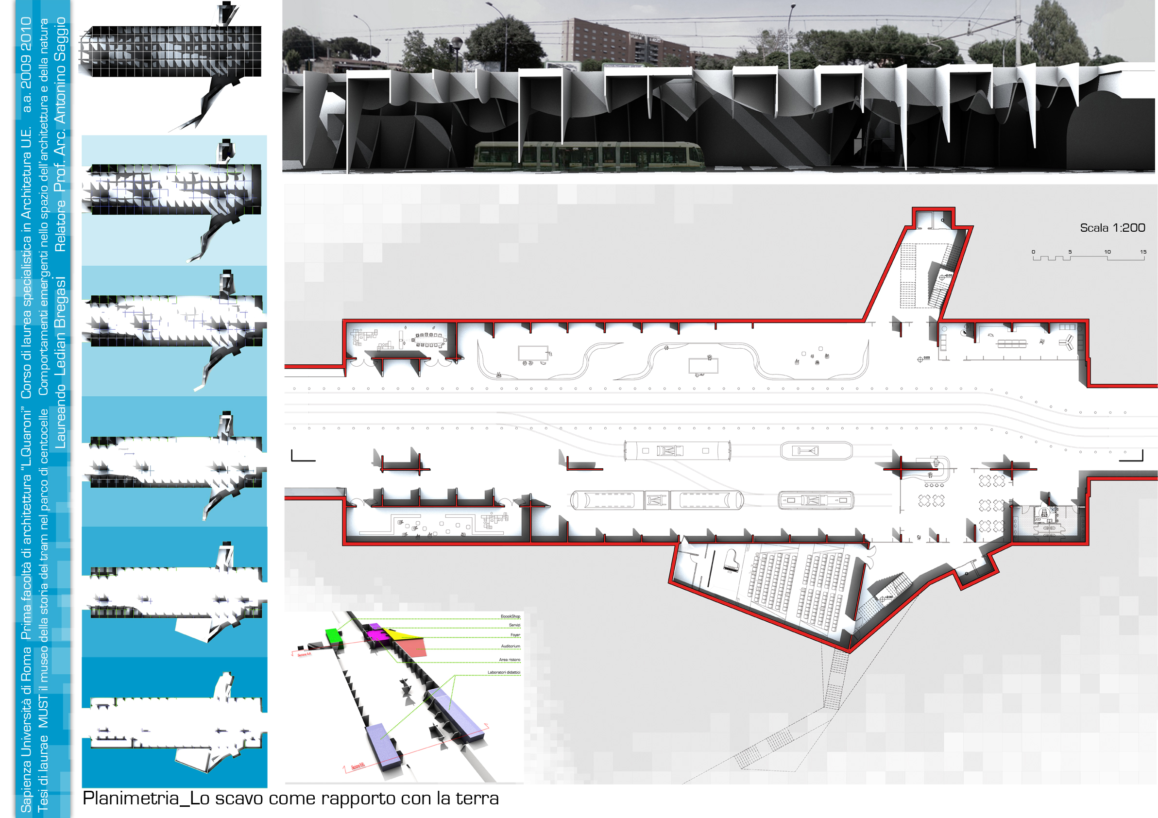 Lo spazio interno del Museo del Tram viene configurato con il principio del comportamento emergente dei sistemi complessi. Delle cellule che rappresentano funzioni diverse si collocano nello spazio generando una configurazione generata attraverso un algoritmo e imprevedibile nello stato iniziale. Questo sciame di cellule, seguendo solo quattro semplici regole, riesce a distribuirsi in una maniera che sarebbe impossibile da calcolare dalla singola cellula. La densità e il peso delle cellule deformano poi un piano orizzontale che una volta sezionato ogni cinque metri in ogni direzione, crea lo spazio interno del museo che, ricordando naturalmente processi orografici e naturali, a nostro avviso fornisce una interessante ambientazione per la funzione prevalente e allo stesso tempo garantisce la continuità del parco in superficie.