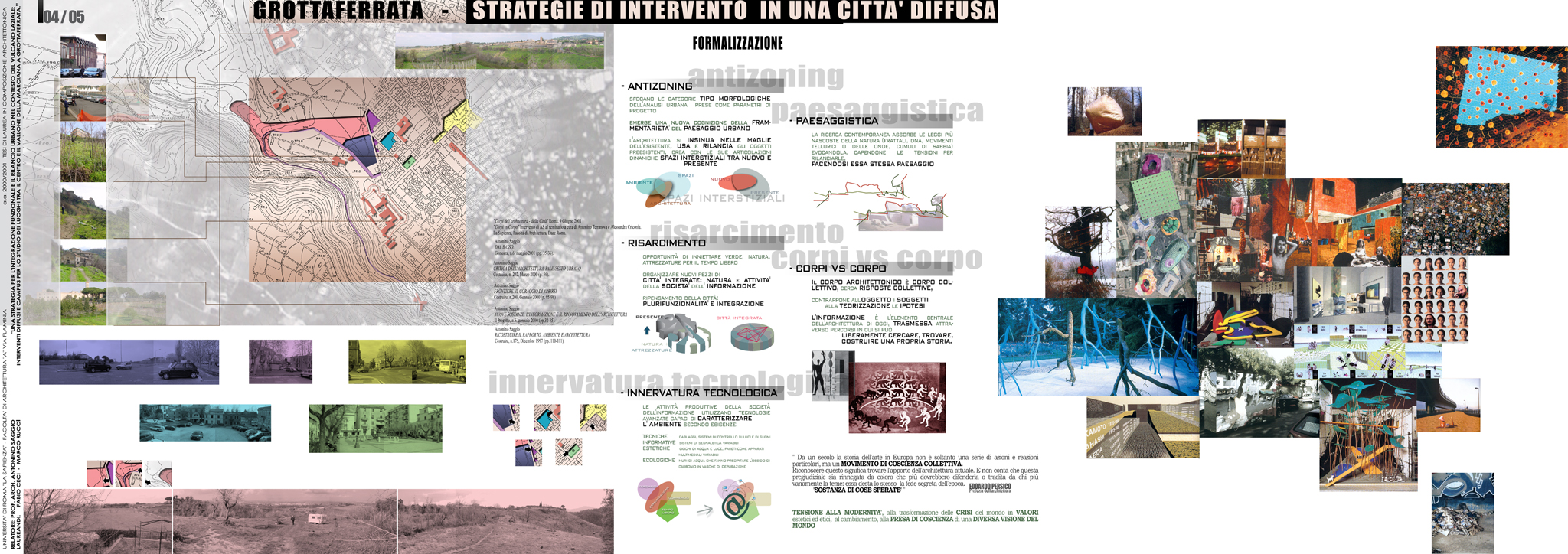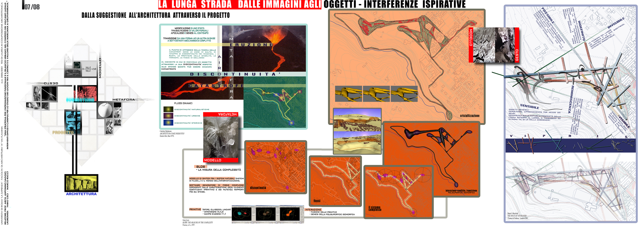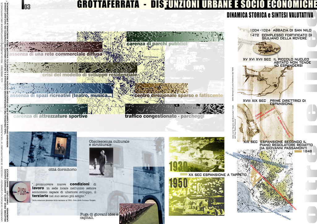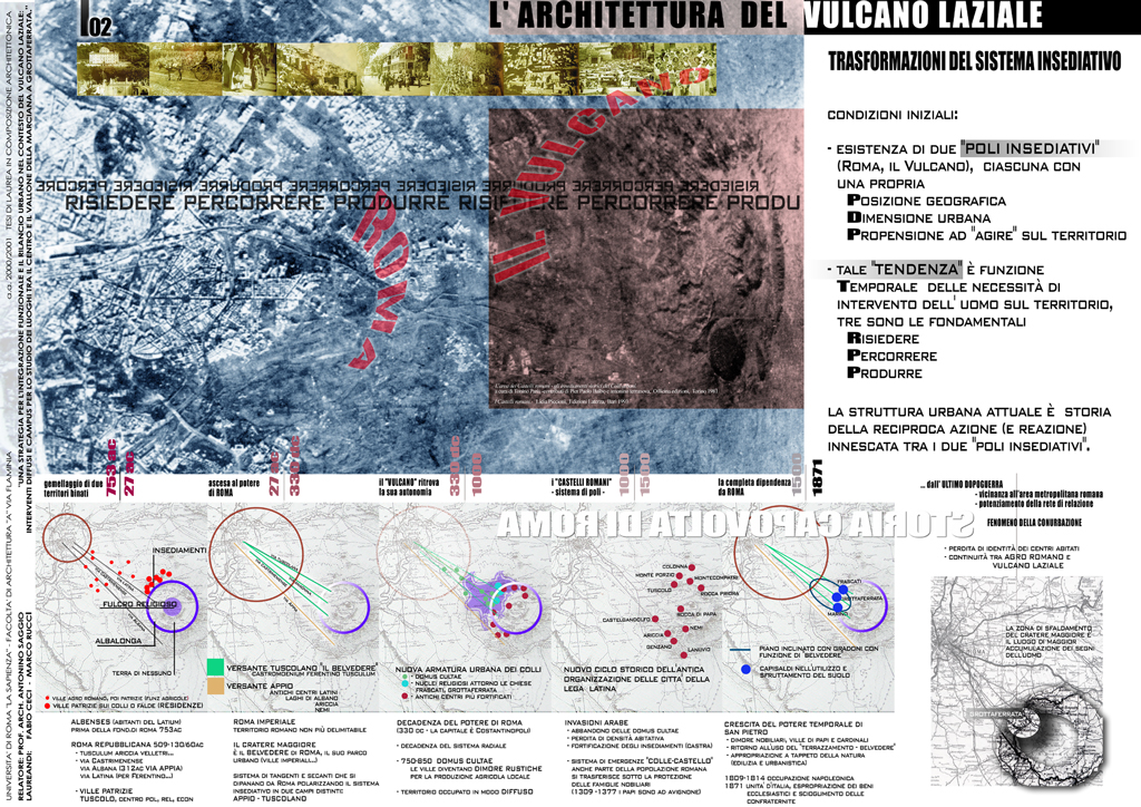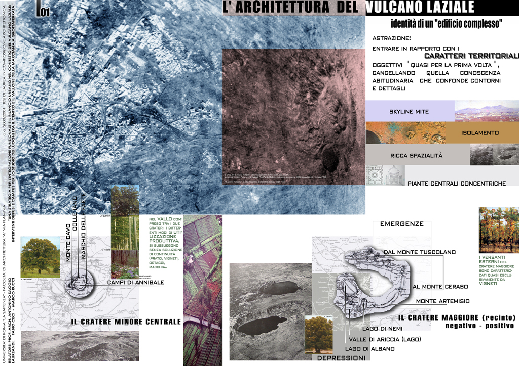 Partendo dall'analisi delle specificità storiche, urbanistiche e paesaggistiche del vulcano laziale e attraverso una attiva collaborazione con l'autorità comunale, il progetto propone una strategia di rilancio urbano che tiene conto della prossimità del comune con la capitale e con le altre cittadine dei colli. L’innovativo programma d'uso si concentra su un complesso da destinare a campus di ricerca per lo studio del vulcano laziale. Il campus si articola in un misto funzioni sia in rapporto a una più vasta strategia di recupero di Grottaferrata sia in relazione allo svolgersi delle specifiche attività di ricerca che in esso si svolgono. Nella creazione degli spazi urbani e dei volumi edilizi del progetto la stessa movimentata orografia del sito viene reinterpreta con procedimenti analogici rispetto al magmatico formarsi del paesaggio vulcanico circostante utilizzando modificatori e attrattori permessi da programmi informatici di simulazione. Il progetto urbano nasce di conseguenza seguendo gli andamenti che seguirebbe una ipotetica colata lavica indirizzata però secondo i punti caldi, le adiacenze e le direttrici derivate dalla specifica situazione urbana.