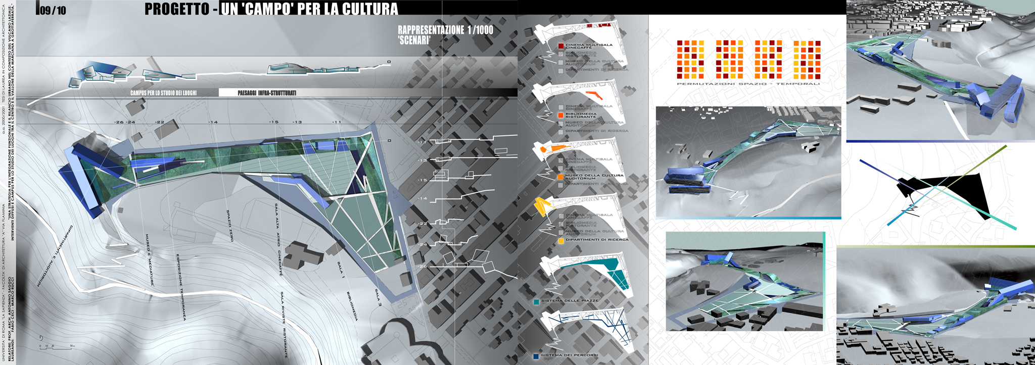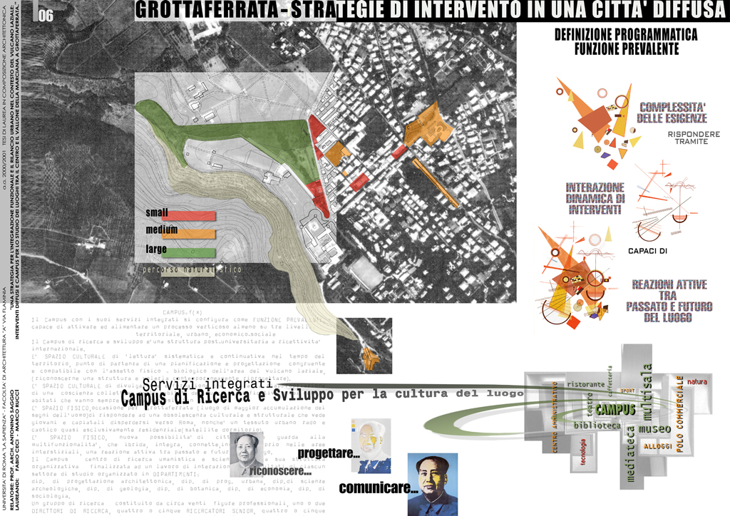 Il Campus di ricerca e sviluppo è a ricettività internazionale e insieme ai suoi servizi integrati (biblio mediateca, cinema multisala) vuolr alimentare un processo almeno su tre livelli: territoriale, urbano, economico-sociale. Mira alla riappropriazione di una coscienza collettiva dell’habitat, dei luoghi significativi e dei centri e tenta di rispondere ad una obsolescenza culturale e strutturale di Grottaferrata che insieme all’esodo dei giovani e dei capitali verso Roma, vede un tessuto urbano rado, caotico e ormai quasi esclusivamente residenziale. Il progetto crea una nuova possibilità di città che guarda alla multifunzionalità, che ibrida, integra, connette, riformula il suolo a partire dai nuovi servizi e dai suoi reali di contatto con la città innescando proprio nelle aree interstiziali un processo attivo di raccordo tra il passato e il futuro del luogo.