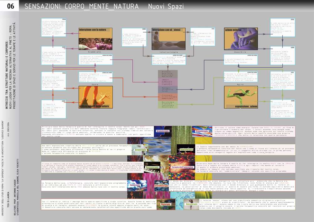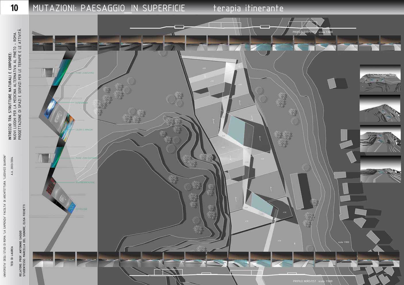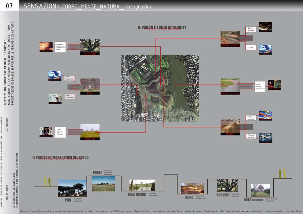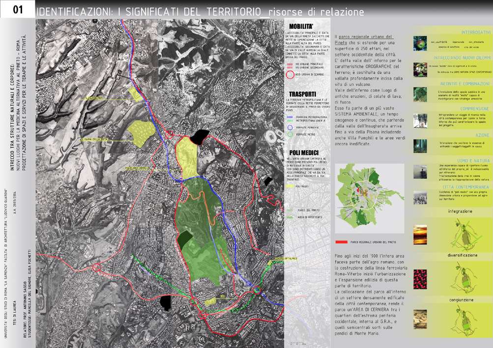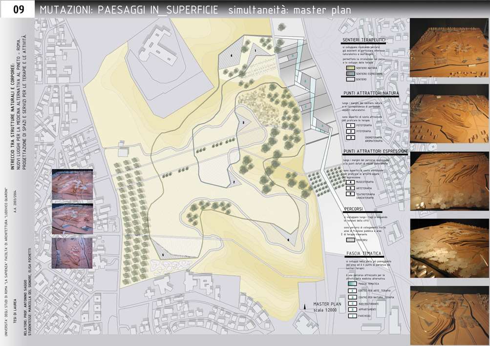 L’idea alla base di questo progetto è utilizzare una parte dell’esteso parco del Pineto, che si incunea nella parte nord occidentale della città, come luogo per la medicina alternativa. Molti motivi contribuiscono alla articolazione della proposta. Innanzitutto la forte presenza di altre strutture terapeutiche nate attorno all’importantissimo polo del Policlinico Gemelli, l’agevole accessibilità attraverso la ferrovia urbana, la grande estensione e il valore del parco anche dal punto di vista ambientale e infine la presenza di alcune piccole costruzioni fatiscenti lungo il confine orientale. Il progetto crea una serie di percorsi e di situazioni terapeutiche nel parco esistente che ne valorizzano l’uso anche per la cittadinanza e propone due strutture estremamente innovative dal punto di vista del programma in sostituzione delle costruzioni preesistenti.