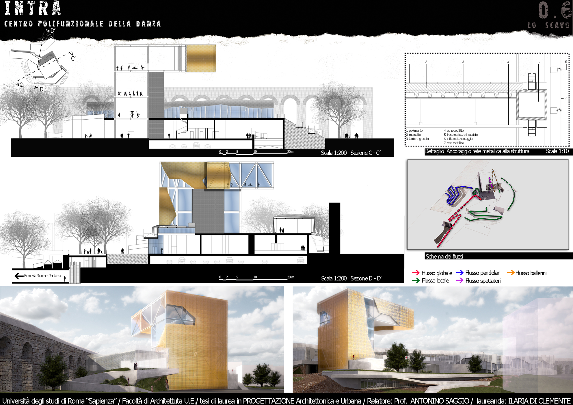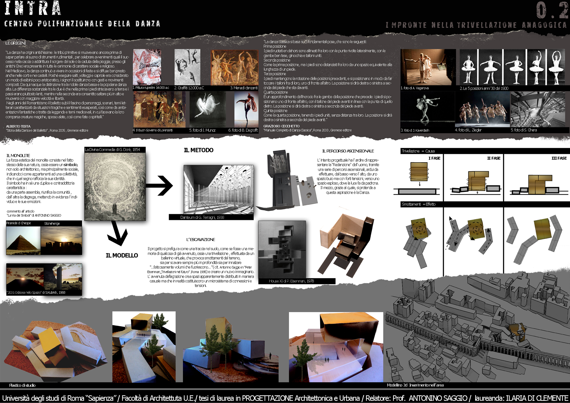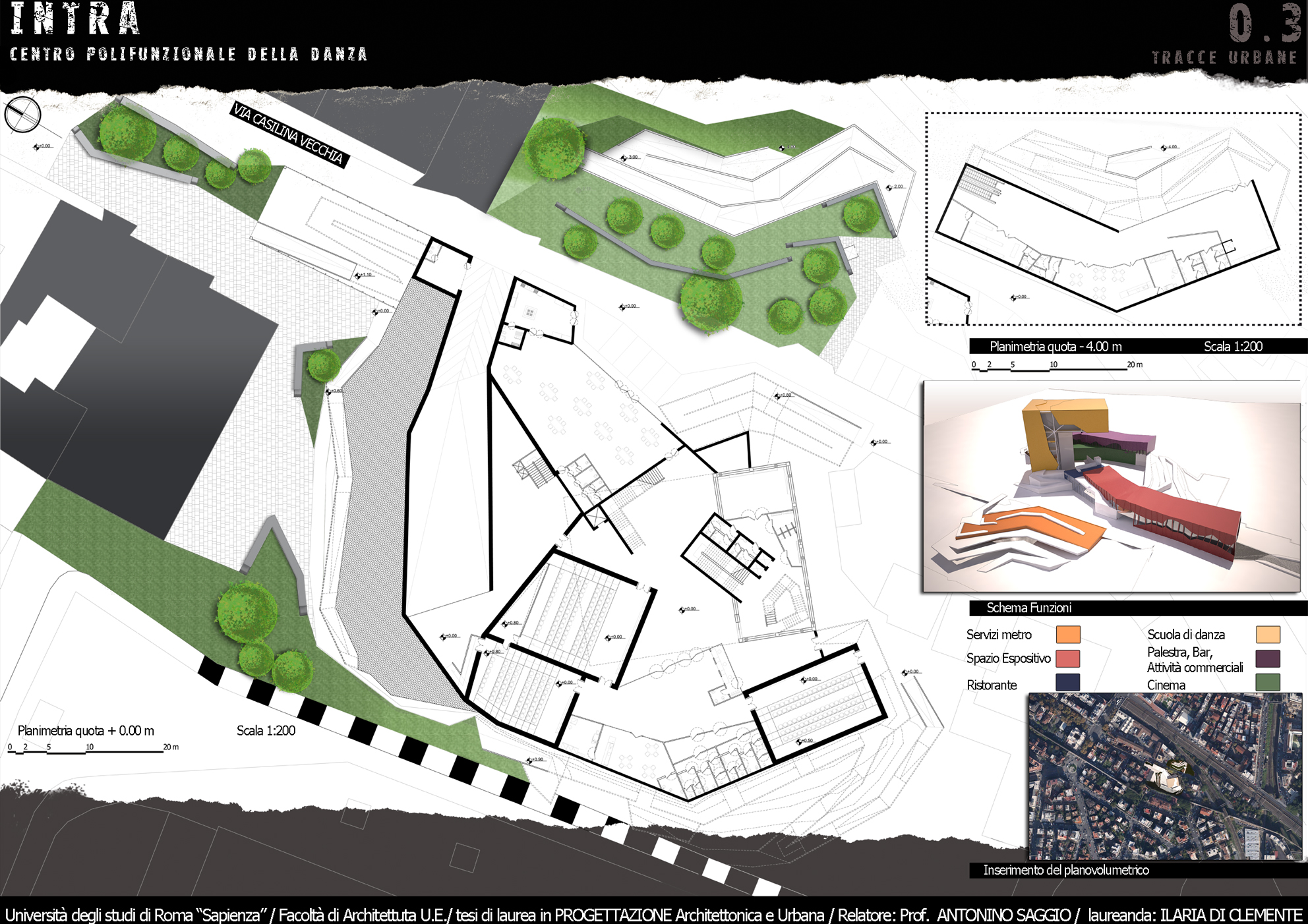 NTRA è un progetto polifunzionale, che si colloca in un’area interstiziale, mal sfruttata e semi abbandonata tra via Casilina vecchia e la preesistenza storica dell’Acquedotto Felice. Tale zona offre diversi servizi infrastrutturali tra i quali la stazione di piazza Lodi della futura linea C della metropolitana e la ferrovia Roma – Pantano che presenta una fermata limitrofa alla zona. Il progetto valorizza questi accessi, ipotizzando un arrivo sotterraneo e propone un’integrazione del nuovo centro con l’esistente Circolo degli Artisti, realtà importante della città. La forza generatrice del progetto ruota sulla Danza, sia dal punto di vista del programma (nelle immediate vicinanze vi è la storica Scuola del Teatro dell’Opera di Roma) sia da quello spaziale e formale. Dal punto di vista del programma, attorno ad una nuova Scuola di danza, catalizzatore di tutto il progetto, orbitano le altre funzioni di servizio ad INTRA che sono, un cinema con tre sale, un ristorante che si affaccia direttamente sull’asse stradale di via Casilina vecchia, uno spazio espositivo che raccorda il livello quota zero a quello di quota + 6.00 m, una palestra ed infine una zona commerciale, comprensiva di negozio per attività sportive, un giornalaio, una libreria, un bar/tavola calda, ed i servizi alla fermata della metropolitana. Dal punto di vista formale, i movimenti di avvitamento e rotazione di un danzatore, a partire dal suolo sino all’innalzamento nello spazio nello sforzo di elevarsi fisicamente e spiritualmente sono il motore della composizione.