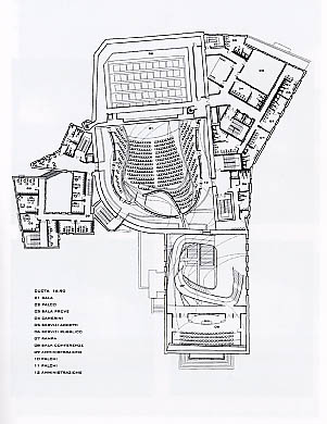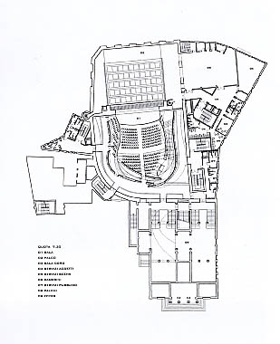 La grande sala teatrale conserva l'impianto a ferro a cavallo della tradizione all'italiana ma ne reinterpreta la spazialità attraverso un aggetto sinuoso delle file dei palchi e l'inclinazione stessa della platea che si trasforma progressivamente in una delle lingue della copertura. Attorno a questo nuovo invaso un sistema dinamico di ballatoi e di percorsi creano uno spazio interstiziale tra il vecchio muro e i percorsi e tra la materia ruvida del laterizio bruciato e la lucentezza dei nuovi materiali.
