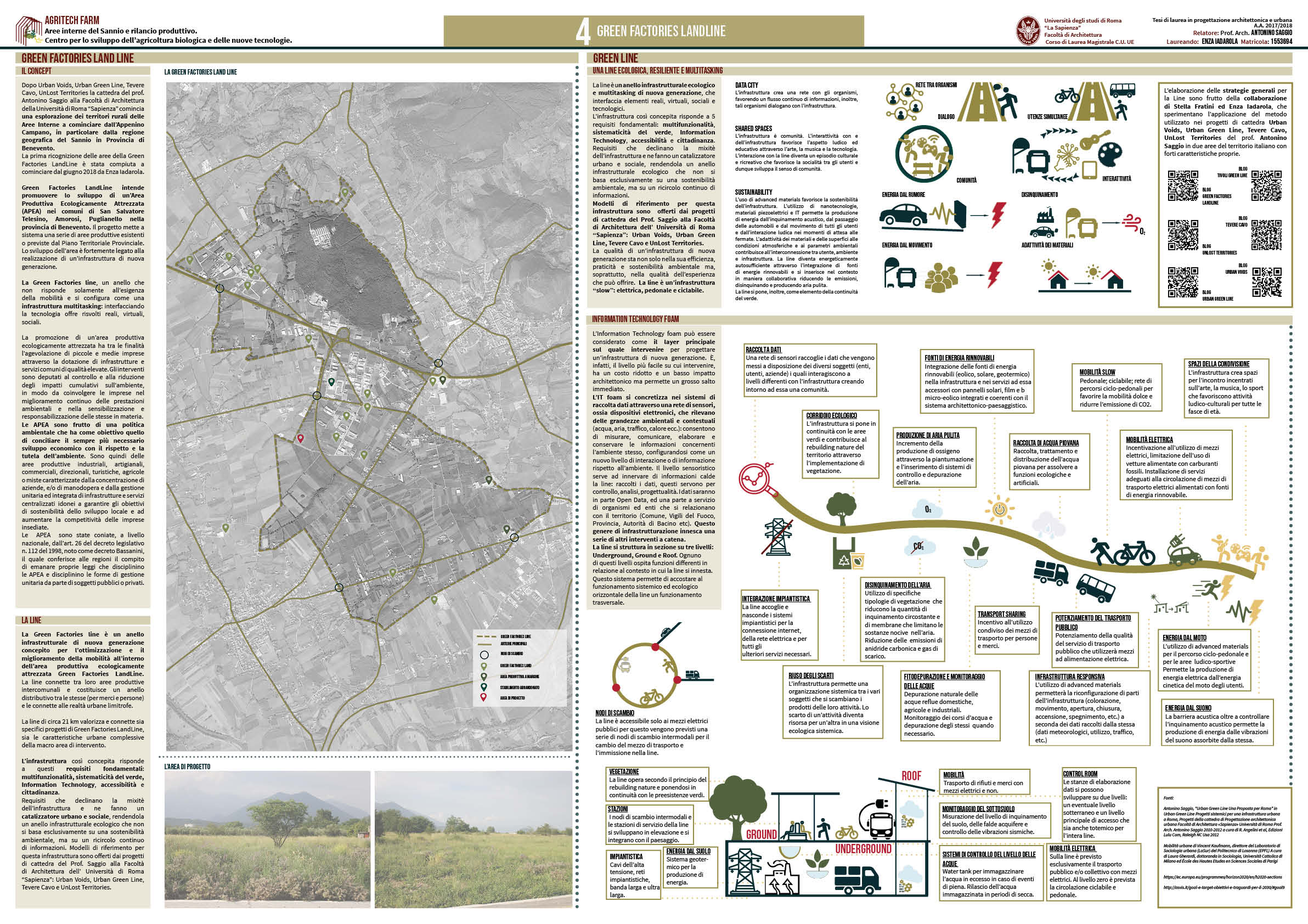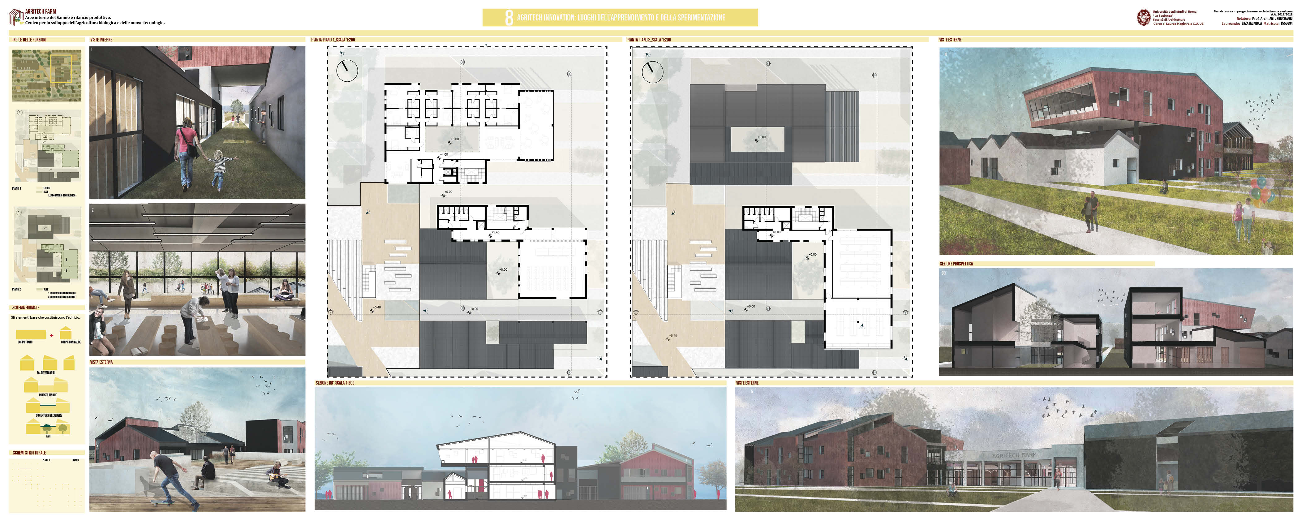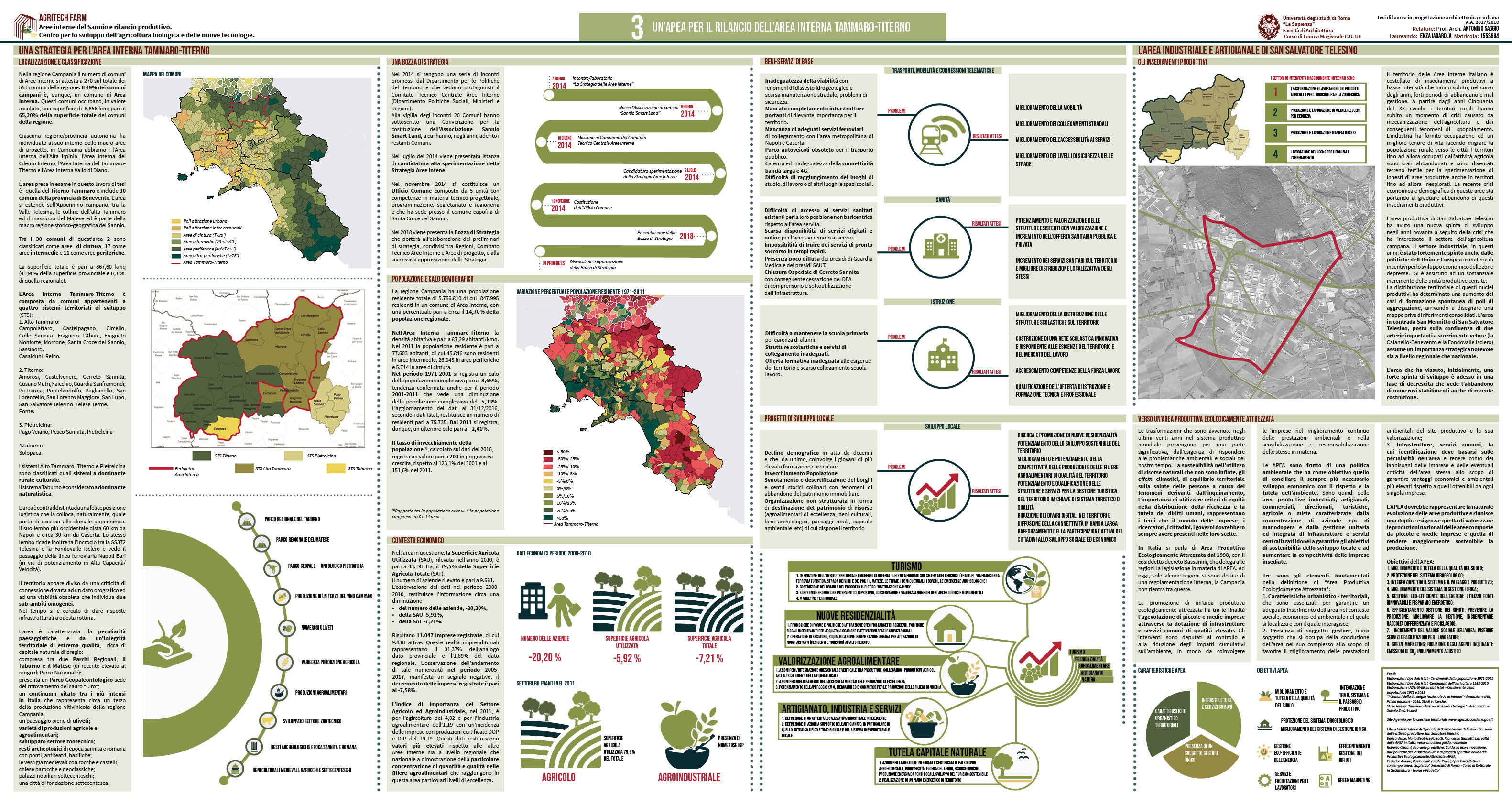 Questi fenomeni sono tipici anche delle aree del Sannio prese in esame che presentano queste caratteristiche oltre ad un deciso invecchiamento delle popolazioni. In queste aree sono presenti anche zone industriali, finanziate da precedenti programmi di intervento nel Meridione di'Italia, che sono spesso inuutilizzate e abbandonate.Il progetto si focalizza nell'area Tammaro-Titerno e include 30 comuni della provincia di Benevento. L’area si estende sull’Appennino campano, tra la Valle Telesina, le colline dell’alto Tammaro ed il massiccio del Matese ed è parte, appunto, della macro regione storico-geogrfica del Sannio. Il progetto si focalizza in particolare sull'area di San Salvatore-Telesino che presenta questi fenomeni insieme alla presenza di strutture produttive abbandonate. Mutuando la strategia da altri progetti di cattedra, il progetto di Enza iadarola si propone innanzitutto un'azione infrastrutturale convinti che il recupero di queste aree debba passare con operazioni in tal senso. Si propone pertanto una "Green Factories Line" che è un anello infrastrutturale di nuova generazione concepito per l’ottimizzazione e il miglioramento della mobilità all’interno dell’area produttiva ecologicamente attrezzata e quale infrastruttura di altre operazioni di avanzamento tecnologico e paesaggistico. La line connette tra loro aree produttive intercomunali e costituisce un anello distributivo tra le stesse (per merci e persone) e le connette alle realtà urbane limitrofe. All'interno della Line si individuano diverse aree potenziali oggetto di intervento, tra cui quella che ospiterà il progetto Agritech Farm in articolare è un Centro per lo sviluppo e la diffusione dell’agricoltura biologica e del suo rapporto con le nuove tecnologie per una produzione sostenibile, innovativa e sociale. All'interno di un disegno di suolo agricolo e produttivo in Agritech Farm si inseriscono pertanto una serie di edifici tra loro integrati, ma anche edificabili in fasi successive. Il progetto si articola attorno a funzioni produttive legate all'incontro, all'educazione e allo scambio caratterizzate da un mercato aperto e scoperto ed è risolto con una architettura ad andamento ortogonale che si inserisce nel disegno di suolo circostante e che trova in alcuni momenti di connessione e di svuotamente delle masse gli episodi spaziali più caratteristici.