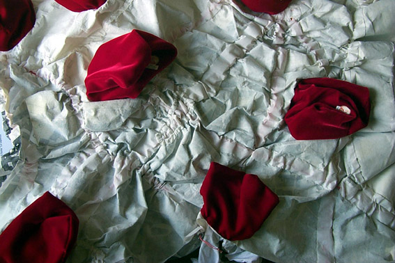 Il tema "tessile" quale opportunità di riflessione progettuale. Un plastico in tela con (verso - sopra) il catastale dalle cui sacche montagnose fuoriescono fotopiano delle aree verdi e (verso- sotto) un paesaggio simbolico con i copricapi dei pontecipi che hanno segnato la storia urbana della città.