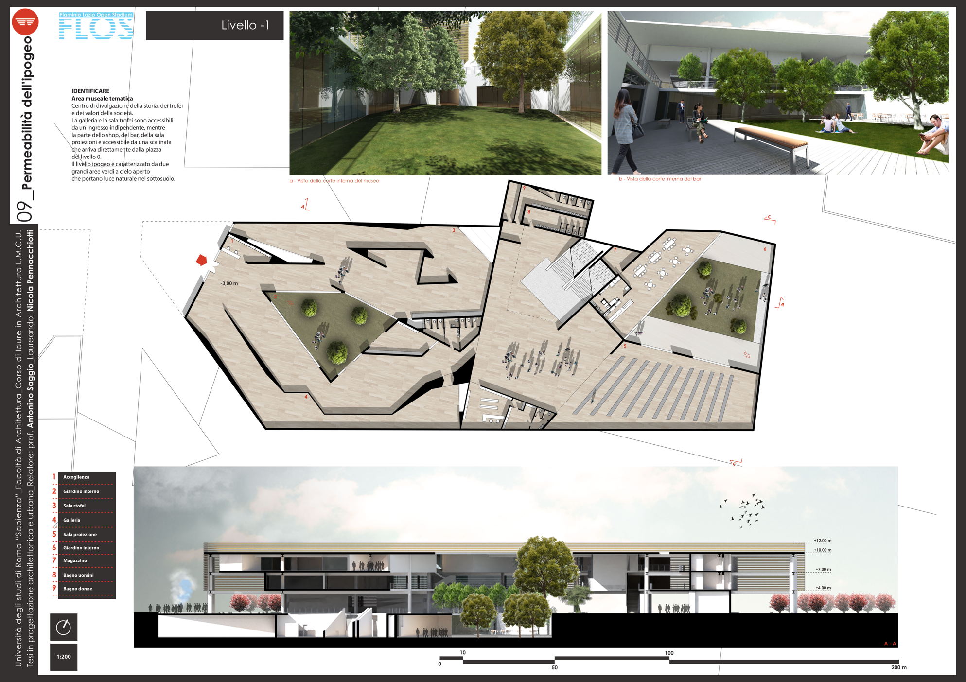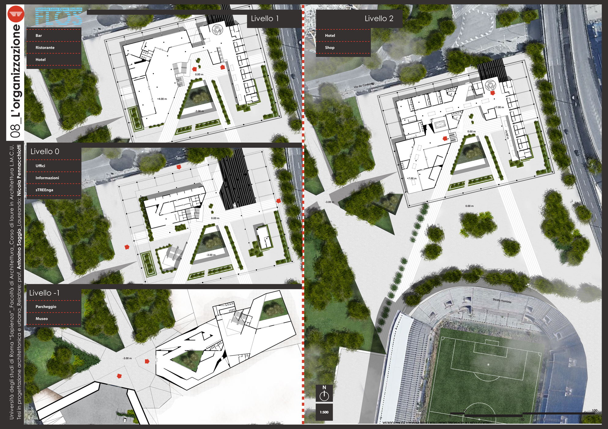 Dal punto di vista architettonico si è optato per una struttura dal volume stereometrico al fine di non interferire con le presenze curvilinee delle due opere di Nervi e del limitrofo Auditorium. La linearità dei volumi richiama la maglia urbana del quartiere Flaminio e l'asse del Viadotto. Il progetto si organizza in un rapporto tra una parte emersa (destinata prevalentemente ad Hotel) ed una parte ipogea dedicata prevalentemente alla valorizzazione della storia della Lazio. Una piazza filtrante consente di essere zona di biglietteria per procedere allo stadio o per vedere la partita in cavea con grandi schermi.