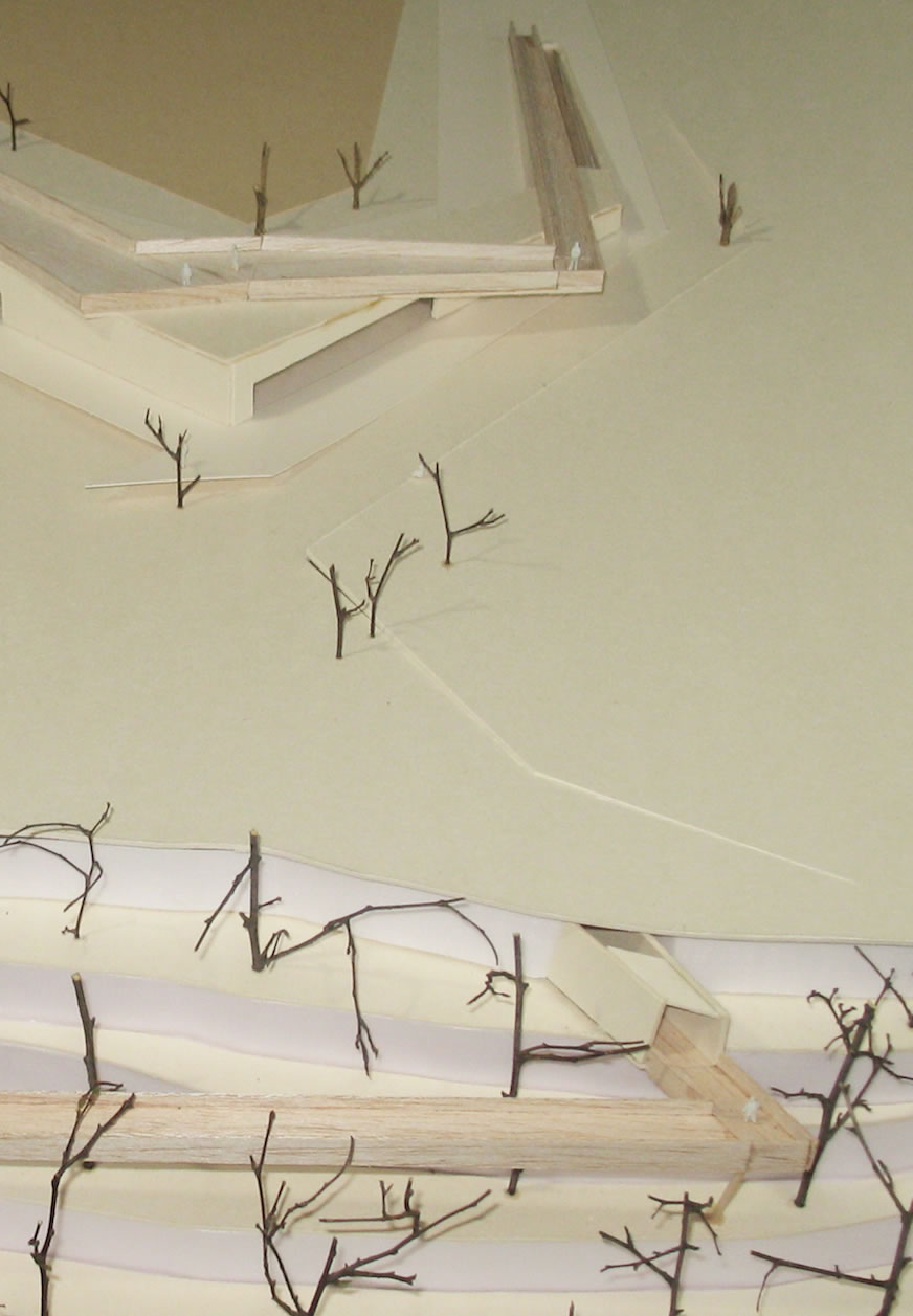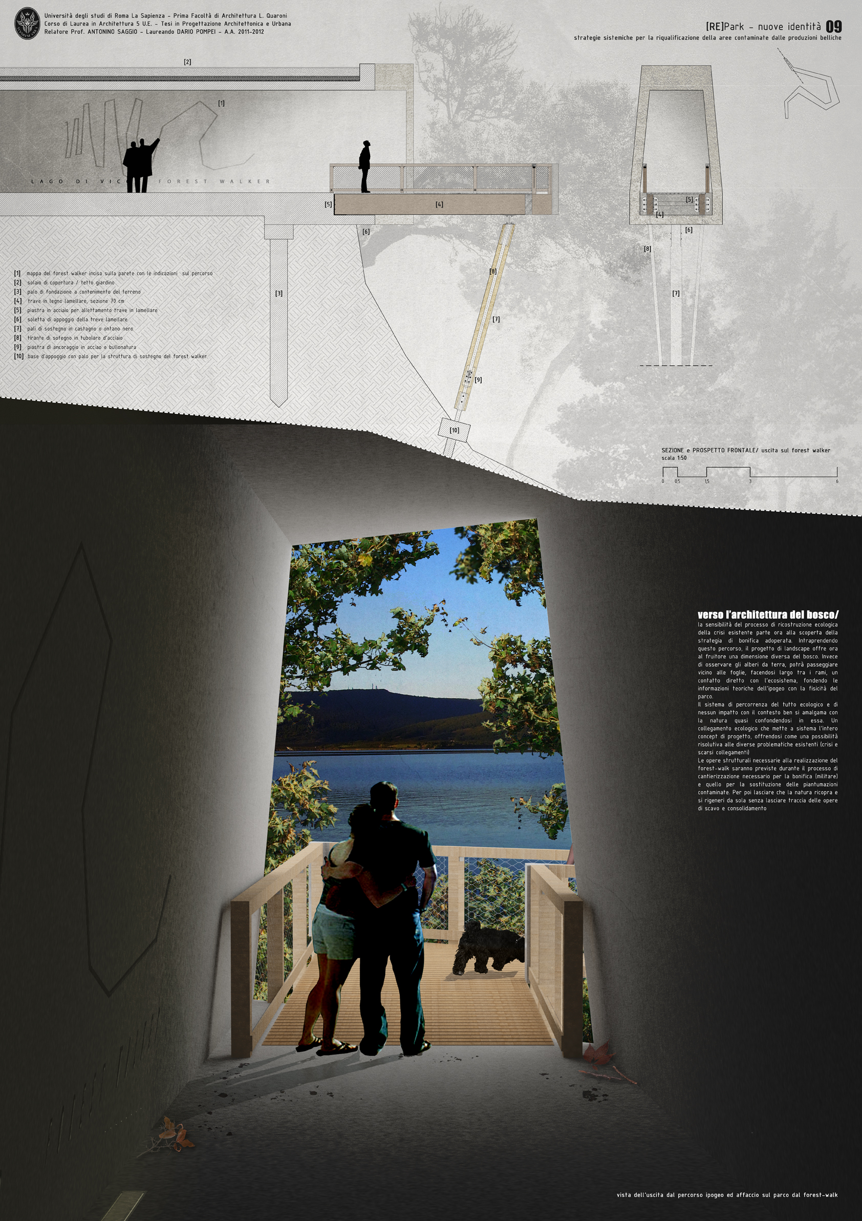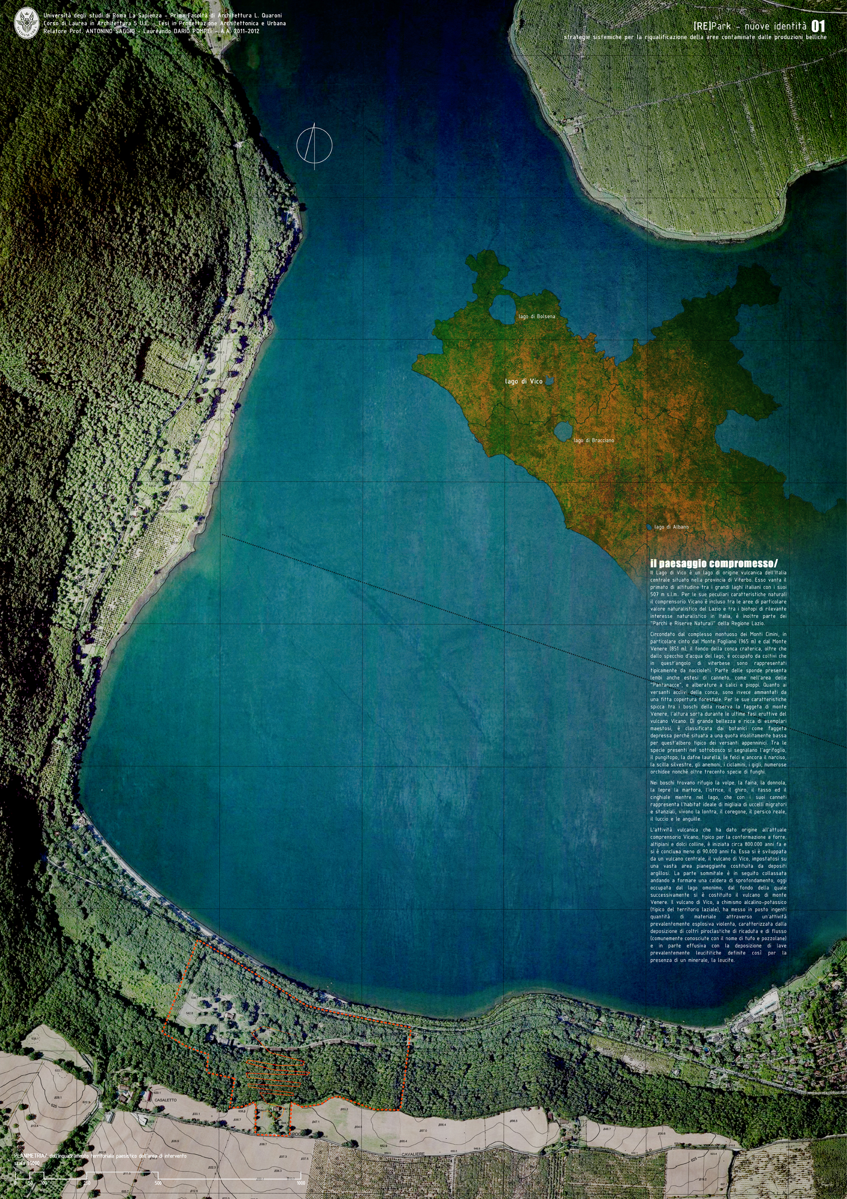 Un nuovo parco sorgerà nella superficie oggi occupata dai residui militari e l’area sarà restituita oltre che alla fauna, ai turisti e ai visitatori che potranno vivere un’esperienza che va ben oltre una semplice escursione mopntana. Una lunga passerella, il forest-walk, attraverserà le nuove piantumazioni fitorimediali in quota. Al visitatore sarà offerto una partecipazione estetica e culturale al processo di bonfica con una sorta di "bio-socializzazione" e una scoperta anche didattica e culturale della strategia perseguita. Il nuovo parco sarà soggetto a continue monitarizzazioni e a manutenzioni che daranno valore aggiunto al progetto di paesaggio. Il forest-walk si innesta in un padiglione di accesso che è pensato attraverso un processo metaforico e spaziale. Il visitatore scende di quota iniziando un percorso didattico espositivo che illustrerà la centralità suolo e del mondo ipogeo (terra, microbi, radici, vita animale e vegetale) per poi emergere alla luce ed aprirsi a una nuova prospettiva del bosco: questa vista avviene iniziando il percorso lungo il forest-walk in quota. Il percorso permette al visitatore una percezione non più dal basso, come di norma, ma “tra” gli alberi alla quota dei rami, consentendogli di osservare da vicino il mondo vegetale e animale dell’ecosistema del lago di Vico. Il padiglione di accesso e la sua piccola funzione culturale ed istruttiva insieme al forest-walk connettono inotre la quota alta delle falda vulcanica, in cui sorgono alcune attrezzature turistiche, alla quota bassa del bacino lago: i flussi turistici possono cosi attraversare il nuovo parco e fruire le coste del lago rlasciandole integre alla loro vocazione naturale.