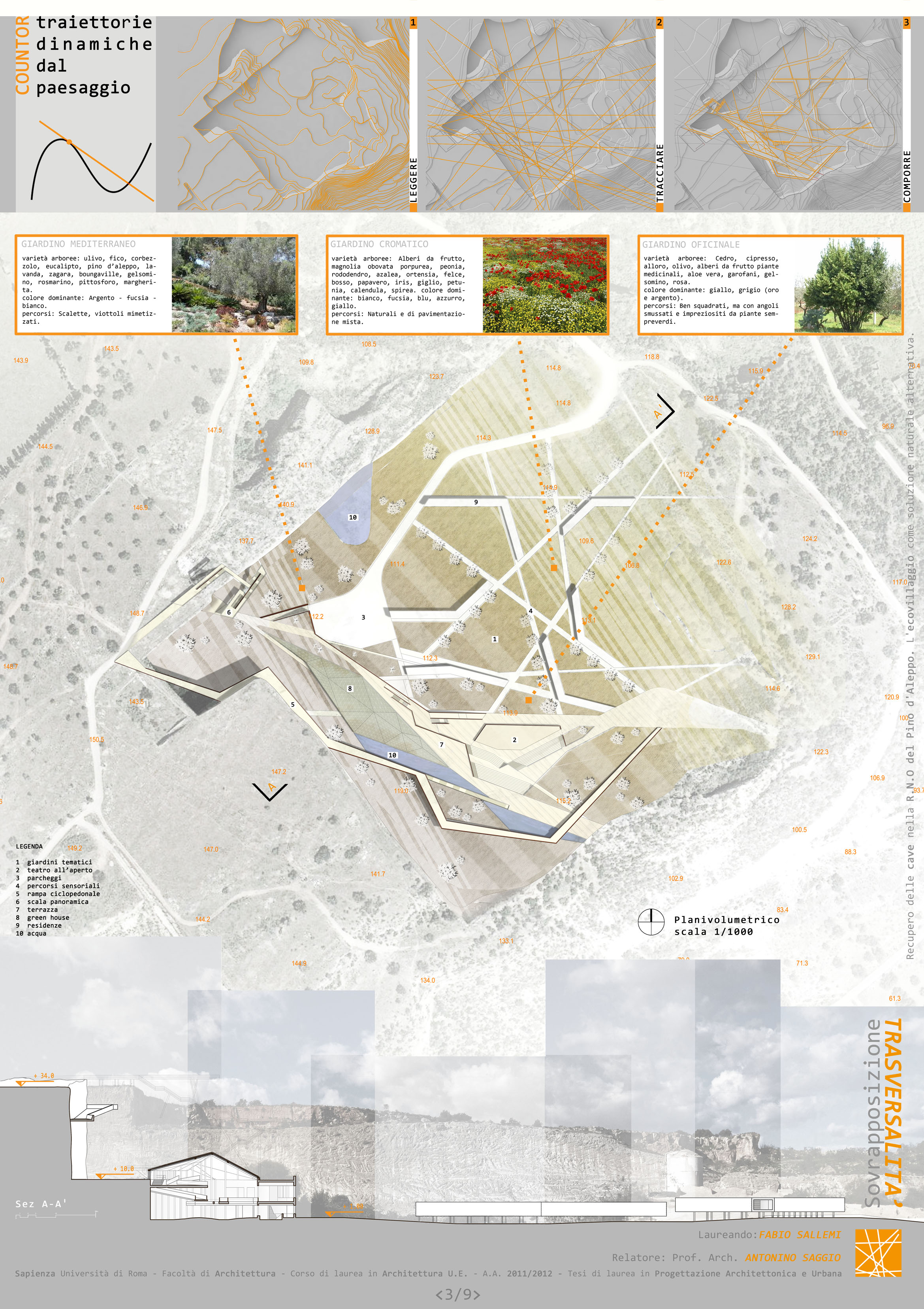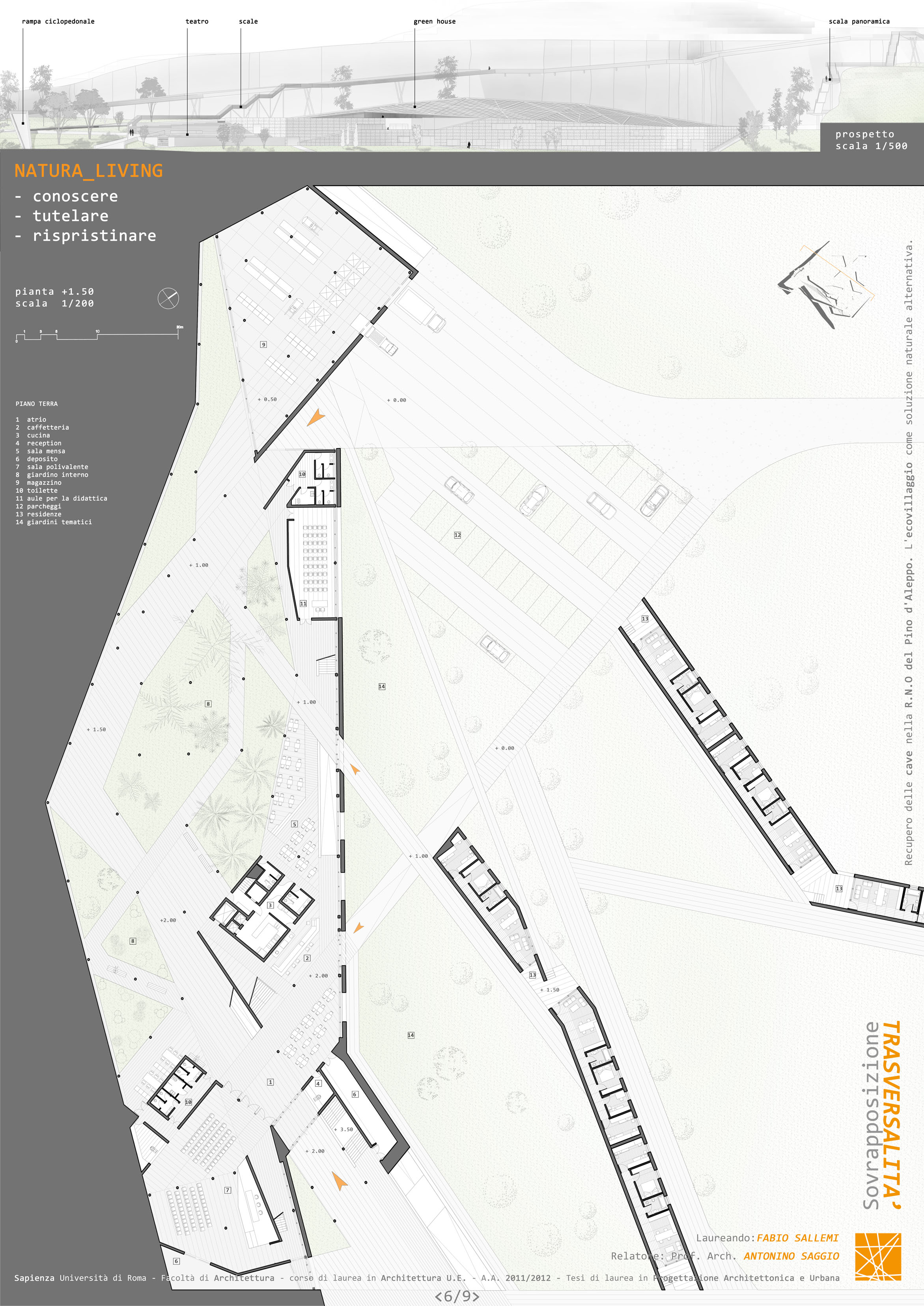 In una cava abbandonata, oggi ricettacolo di rifiuti e discarica di elettrodomestici si instaura un progetto riparatore. Riparatore perchè inserisce una nuova funzione educativa e di tutela ambientale, perchè innesta vitali attività economiche come una serra e servizi di ristorazione, riparatore perchè crea spazi di espisizione lungi i suoi percorsi sia esterni che interni, riparatore perchè determina un uso agricolo degli spazi circostanti e perche infine fa vibrare l'esistente con pochi segni minimali di architettura: le rampe-ponti che conducono dalla quota di accesso superiore alla cava nella parte bassa (quasi consentendo al visitatore di senire le pareti segate della montagna) e perchè attraverso una serie di corpi di architettura, zigzanati nel terreno come fenditure, si esalta la magica forza del luogo. Il tutto entro una riserva naturale e a ridosso della bella citta cardo decumanica di Vittoria, nella parte sud della Sicilia.
