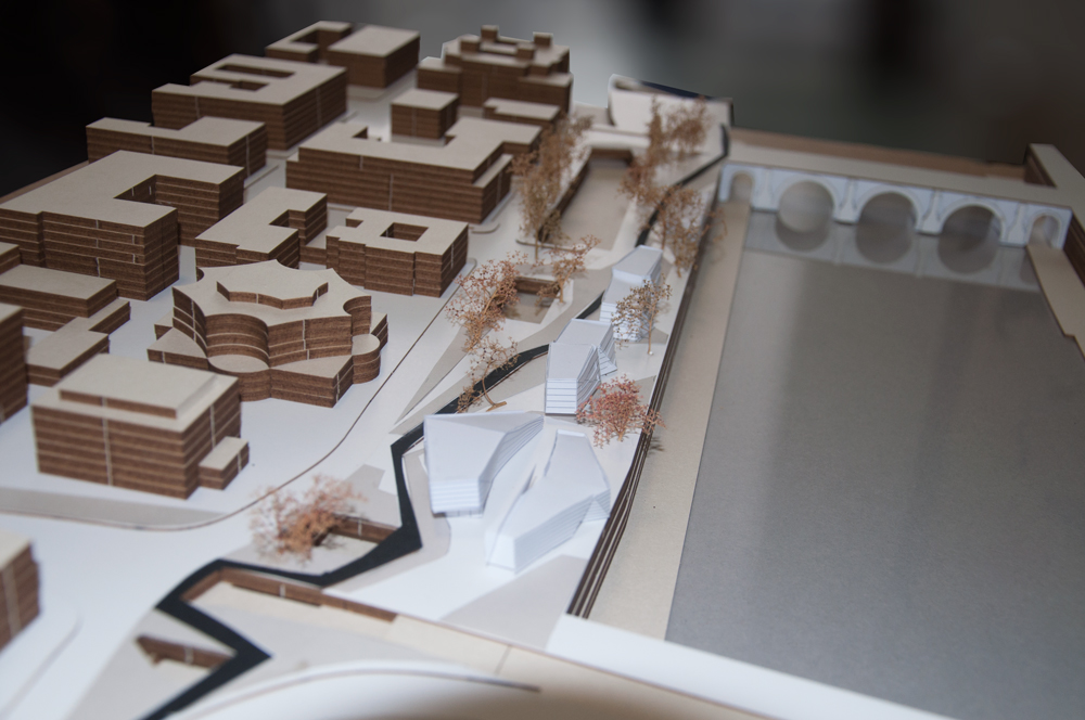 Gli edifici si presentano come corpi emersi, collegati tra loro a grappolo tramite un sistema ipogeo che ospita alcune delle funzioni principali; in tal modo il complesso si presenta fortemente aperto e permeabile assorbendo e accogliendo i flussi di turisti e di popolazione che hanno nello spazio pubblico del parco occasione di ritrovare il contatto con il fiume e avere ristoro nel passaggio da una meta all’altra o nei momenti di tranquillità della vita quotidiana.