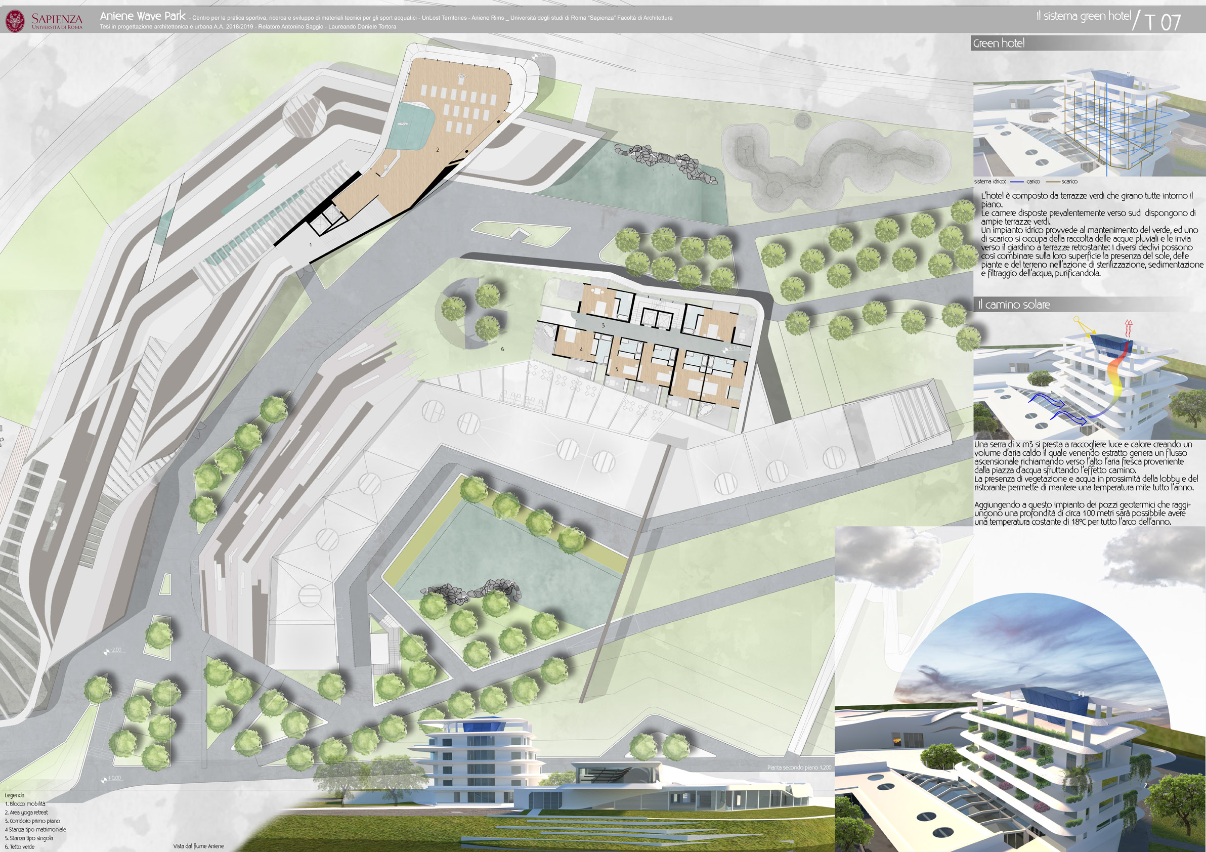 L'Aniene Wave Park nasce dalla necessità di ristabilire un legame tra fiume e città attraverso la rivitalizzazione delle rive abbandonate al degrado e in pa particolare attraverso l'uso dell'acqua come catalizzatore sociale. L'idea di un centro per sport acquatici nel centro di Roma viene dalla volontà di rendere più fruibile in particolar modo la pratica del kitesurf e del surf, sport che oltre che ad essere particolarmente in voga al momento, si prestano particolarmente al progetto in quanto necessitano di una preparazione a terra notevole. Il progetto nasce sulle sponde dell’Aniene, in zona Colli Aniene, una vasta area a ridosso del fiume in una zona particolarmente ventosa che può permettere ad atleti, appassionati o semplicemente a chi cerca una nuova avventura di vivere un’esperienza acquatica a portata di città risparmiando spostamenti inconciliabili con il poco tempo libero a disposizione e eliminando il rischio che, oltretutto, gli stessi spostamenti possano essere vani a causa delle avversità climatiche che caratterizzano la costa mediterranea. Il progetto è strutturato su 4 livelli: architettonico, tecnologico, ecologico e di marketing. La parte architettonica prevede la realizzazione di un complesso sportivo che ospiterà al suo interno piscine (agonistiche e ludiche), vasche con onde artificiali utili alla pratica del surf, ma anche adatte a testare delle attrezzature sportive prodotte in loco. L’aspetto tecnologico è il fulcro del progetto: sono presenti all'interno del parco dei laboratori di stampa 3D nei quali saranno realizzate attrezzature sportive (pinne, tavole, accessori, ecc.) a basso costo e a basso impatto ambientale L'aspetto ecologico riguarda sia la produzione in laboratorio che il parco. - Produzione Nei laboratori verranno usati prodotti ecologici, prodotti provenienti da materiali riciclati (abs, pla, pet ecc), prodotti provenienti dallo stesso centro per la realizzazione di tavole Eco Board che verranno usate come bandiere nella lotta contro l’inquinamento acquatico. - Il parco All'esterno della struttura sono previste le seguenti realizzazioni: a) Il biolago: una piscina naturale, uno specchio d’acqua balneabile ed ecosostenibile, dove le piante acquatiche e specifici microrganismi a loro associati sostituiscono l’uso del cloro. b) vasche per la fito-depurazione: sono delle vasche in cui sono presenti diverse varietà di canne le quali assorbono le sostanze inquinanti dall'acqua rendendola pulita, una tra queste il bamboo (che può essere potato ed utilizzato per le attrezzature - a km0) c) delle piazze d'acqua allagabili nei peridi piovosi così da recuperare l'acqua piovana attraverso l’utilizzo di cisterne sotterranee per lo stoccaggio e il riutilizzo della stessa per le utenze della struttura e per il suo controllo bioclimatico. Progetto di marketing L'idea principale è quella di creare un brand di tavole componibili sia per il surf che per il kitesurf che promuova la produzione “home made” e l’utilizzo di materiali ecosostenibili e/o riciclati.