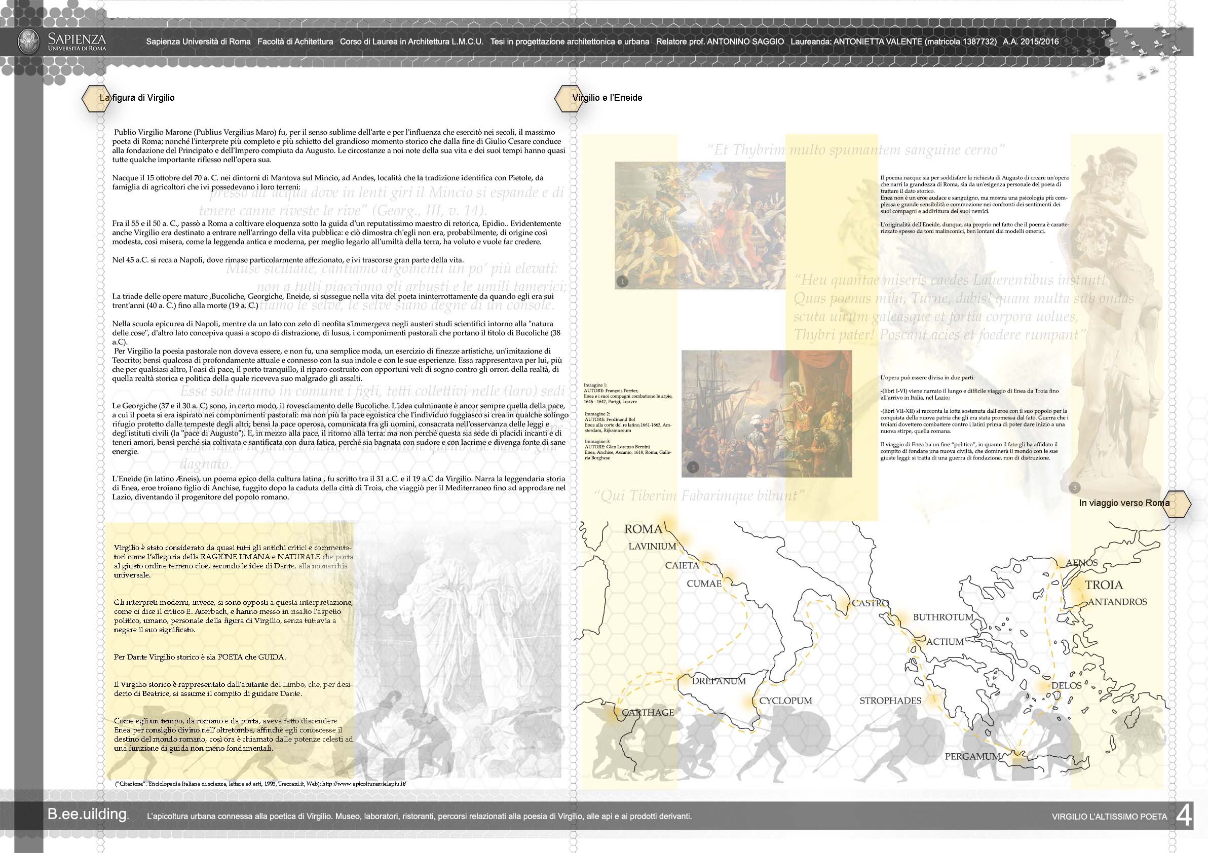 Il progetto si insedia in una area marginale, in una intersezione tra la collina di Monte Mario, l’inizio di Viale Angelico, il Tevere e il complesso di case popolari di Piazza maresciallo Giardino. Analizzando questa intersezione urbana, si è contemporaneamente riflettuto sul ruolo odierno delle api che, sempre più sospinte dall’uso dei pesticidi agricoli, si muovono in città. Allo stesso tempo, lo sviluppo dell’apicoltura urbana sta avendo uno sviluppo sensibile in diverse situazioni. Nasce di conseguenza l’idea di ideare un progetto che si incentri in questa attività. Approfondendo lo studio sulle api e sulle diverse componenti naturali e letterarie legate a questo insetto si è individuato nel poema del grande poeta latino Virgilio un importante precedente. Si è anche scoperto che in Italia vi è solo un museo dedicato al poeta latino e nessuno a Roma. Da questo intreccio nasce il programma del progetto. Un museo dedicato al poeta Virgilio ed in particolare all’Eneide e alle Georgiche e contemporaneamente all’apicoltura urbana. La localizzazione nei pressi del fiume Tevere sembra più che appropriata anche perche Enea arrivò a Roma risalendo il suo fiume.