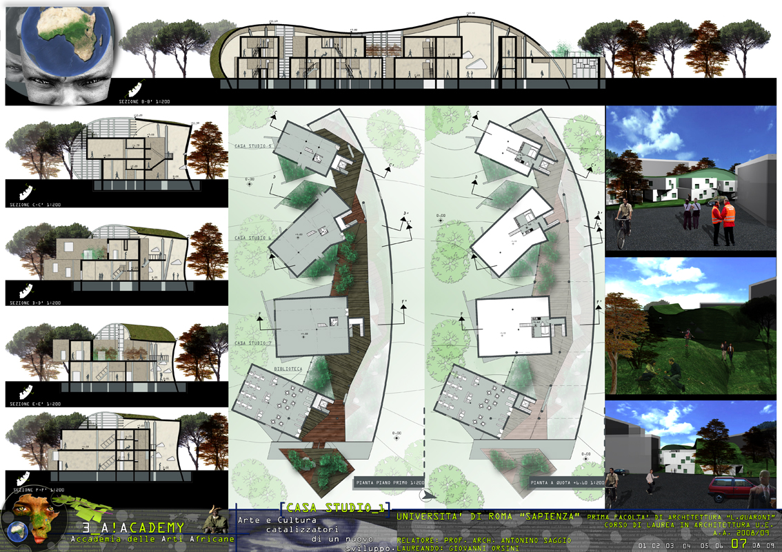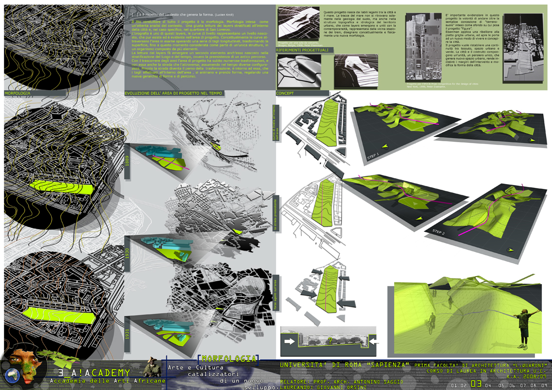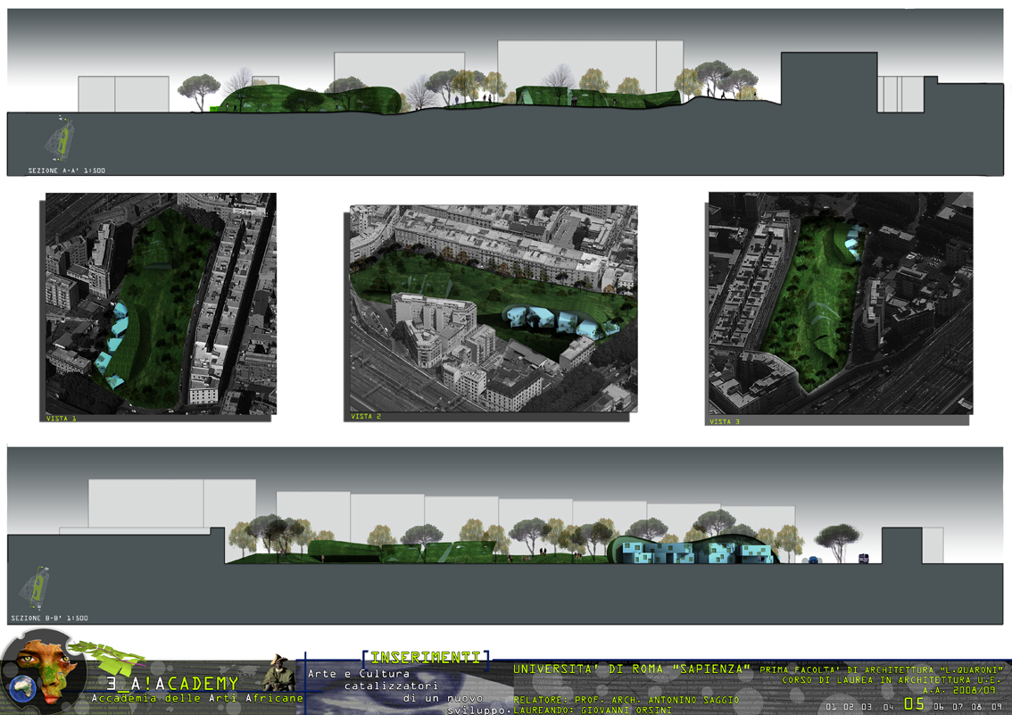 In un sacca urbana del quartiere occupata da piccolo artigianato (e di cui a lungo si è discusso per usi alternativi più consoni allo sviluppo della città contemporanea), nasce “3_A! Academy. Accademia delle Arti Africane: Arte e cultura catalizzatori di un nuovo sviluppo”. Si tratta di una proposta per il quartiere che si si basa sulla assenza di una accademia per gli artisti e i letterati africani nella nostra città. Assenza grave, anche simbolicamente, visto che la maggior parte dei paesi occidentali hanno ciascuno una sede. La nuova struttura che si intende condivisa tra i paesi che non hanno questa importan te risorsa, offre similmente alle altre accademie, spazi residenziali, studi, una biblioteca, laboratori e zone espositive. L’articolazione del progetto è determinata da un disegno di suolo che, sviluppandosi da nord a sud come una vallata, consente di innestare nella zona meridionale meridionale, maggiormente privato, padiglioni edilizi che ospitano le diverse case studio e nella parte settentrionale, a cerniera con il quartiere, una zona espositiva e di servizi. Fondamentale è la caratteristica di parco del progetto che risarcisce di verde un quartiere che ne è storicamente privo e allo stesso tempo cattura un sentire informale e libero in sintonia con gli insediamenti spontanei africani. |