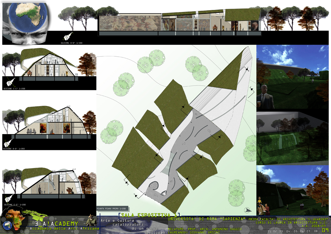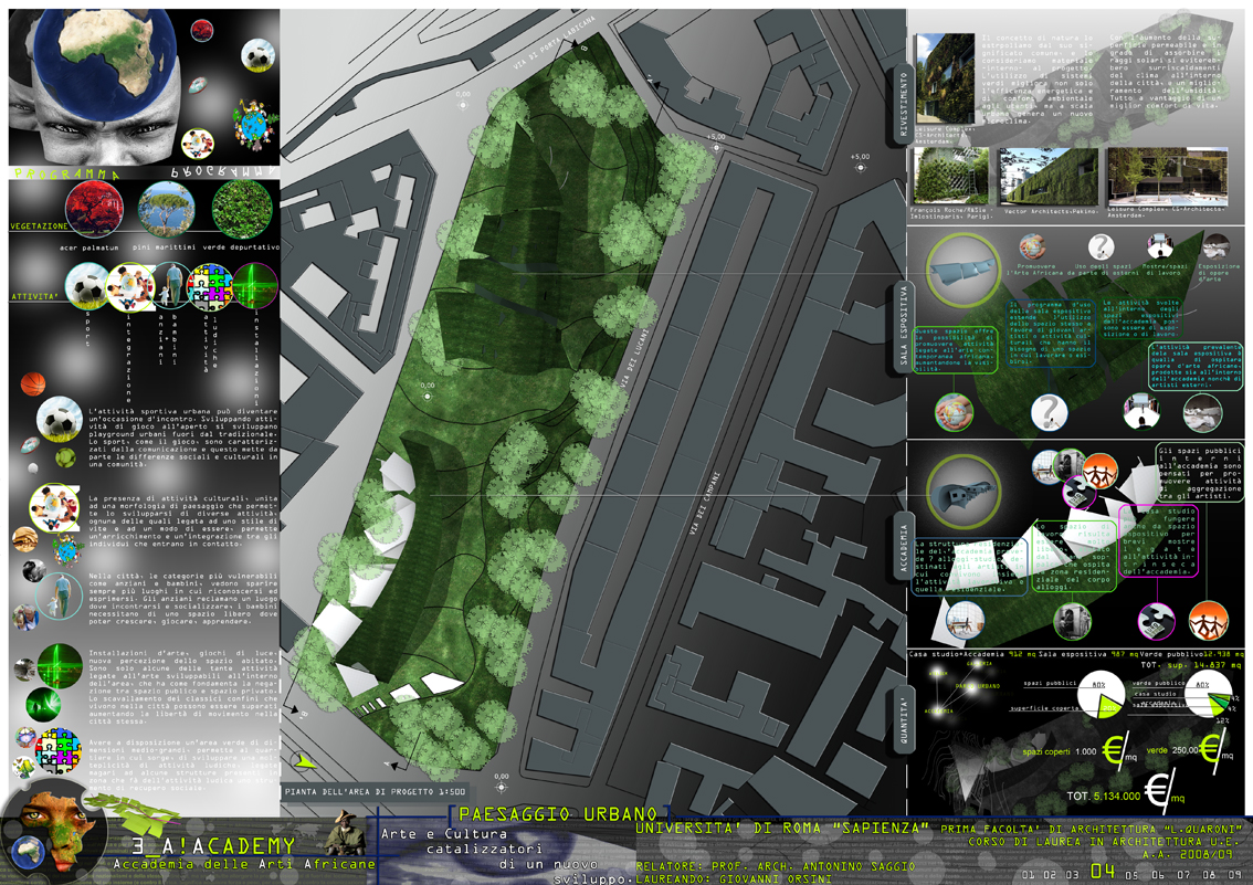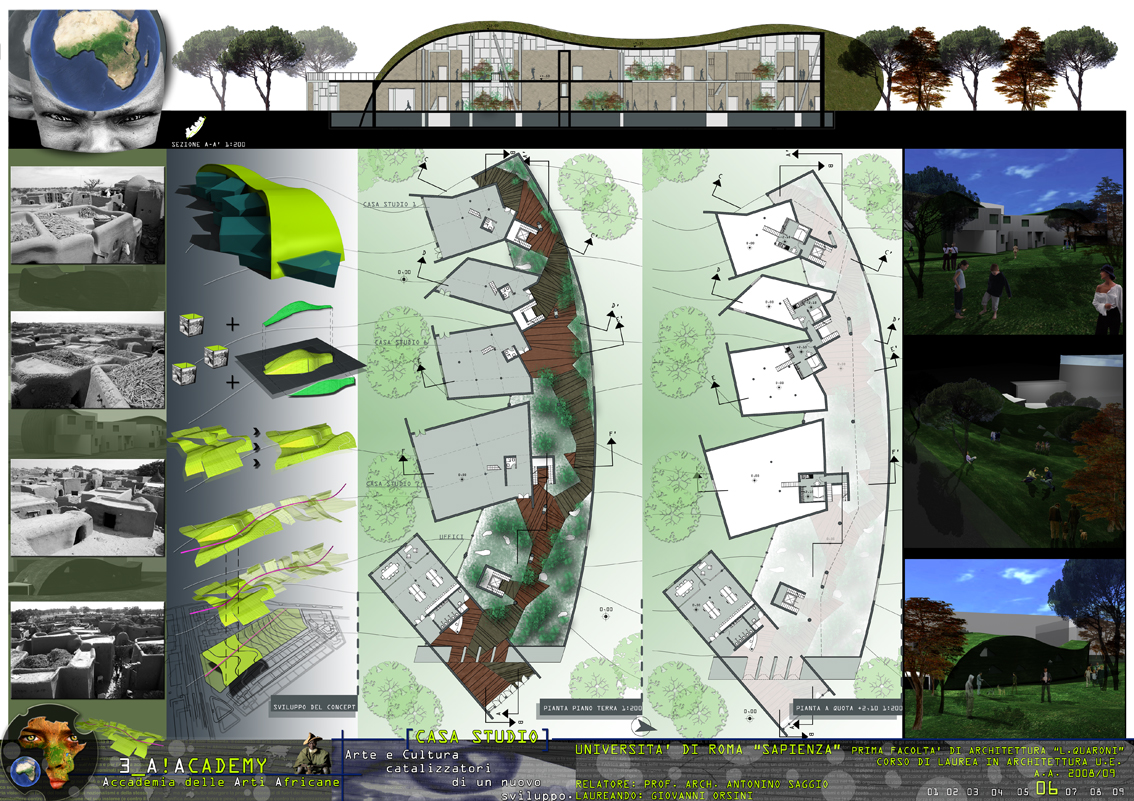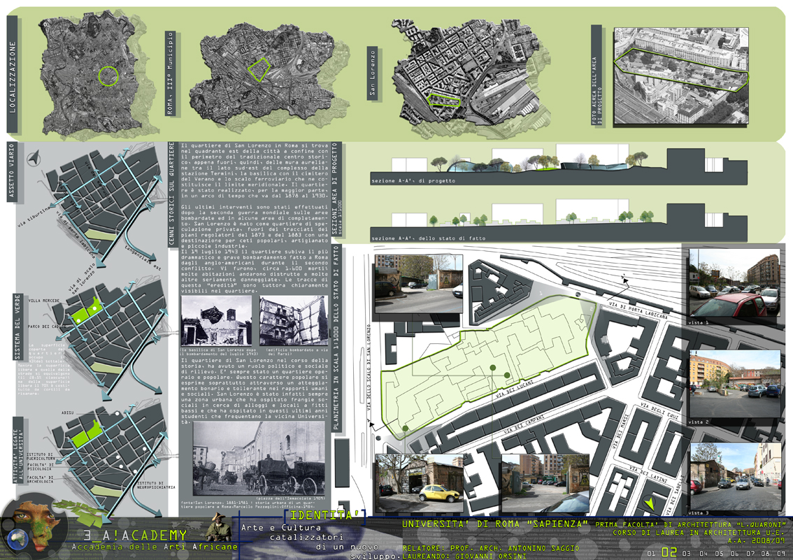In un sacca urbana del quartiere occupata da piccolo artigianato (e di cui a lungo si è discusso per usi alternativi più consoni allo sviluppo della città contemporanea), nasce “3_A! Academy. Accademia delle Arti Africane: Arte e cultura catalizzatori di un nuovo sviluppo”. Si tratta di una proposta per il quartiere che si si basa sulla assenza di una accademia per gli artisti e i letterati africani nella nostra città. Assenza grave, anche simbolicamente, visto che la maggior parte dei paesi occidentali hanno ciascuno una sede. La nuova struttura che si intende condivisa tra i paesi che non hanno questa importan te risorsa, offre similmente alle altre accademie, spazi residenziali, studi, una biblioteca, laboratori e zone espositive. L’articolazione del progetto è determinata da un disegno di suolo che, sviluppandosi da nord a sud come una vallata, consente di innestare nella zona meridionale meridionale, maggiormente privato, padiglioni edilizi che ospitano le diverse case studio e nella parte settentrionale, a cerniera con il quartiere, una zona espositiva e di servizi. Fondamentale è la caratteristica di parco del progetto che risarcisce di verde un quartiere che ne è storicamente privo e allo stesso tempo cattura un sentire informale e libero in sintonia con gli insediamenti spontanei africani. |
