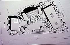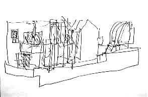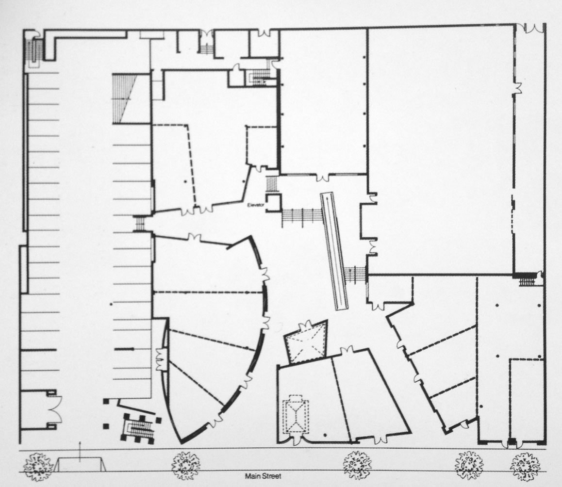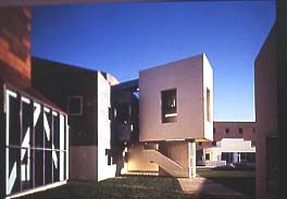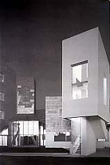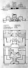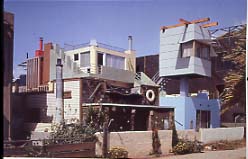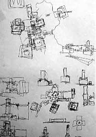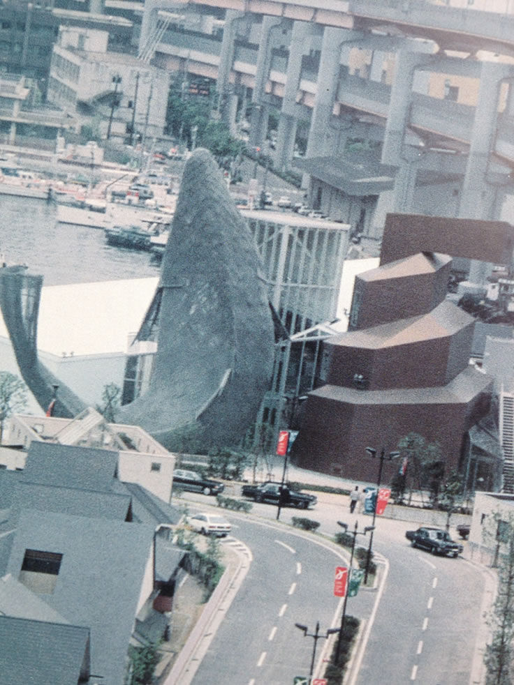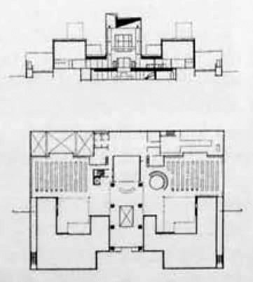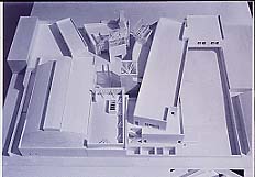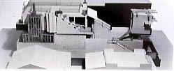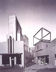 Attorno a una "T" si dispongono una serie di padiglioni. Le forme sono le più varie (cubi, ampolle, tettoie, pagode) e altrettanto ricchi e contrastanti sono i materiali di finitura. In questa opera celebrata, le fratture tra i volumi, il loro assemblaggio, le figure fantasiose, l'aprirsi allo spazio conformato dagli edifici raggiungono l'apice. Un altro passo e vi sarebbe caduta: il gioco di forme diventare bizzarria, i materiali sfoggio, il talento virtuosismo.