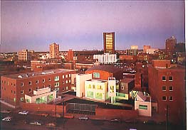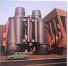 Qui la costruzione in stadi è anche cronologica. Al margine opposto rispetto al bianco edificio preesistente, vi è una foresta di pilastri e travi inclinate rivestite in rame, al centro, un macroscopico binocolo (ideato da Oldenburg) che contiene due sale di riunioni. Un edificio manifesto, per una agenzia di pubblicità: la stessa idea di un ristorante (in basso a sinistra) che si organizza attorno alla scultura di un pesce. Un'adesione troppo disinvolta alle ragioni commerciali della società di massa?