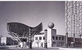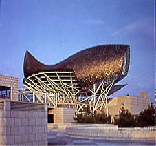 Convincente è l'evoluzione a Barcellona (in basso a destra) dove la metafora marina si fa astratta grazie alla costruzione in listelli e rimanda ad altre suggestioni: una voliera per i gabbiani, le reti dei pescatori, gli intrecci delle corde di un veliero, una caravella che lega nuovo e vecchio mondo.