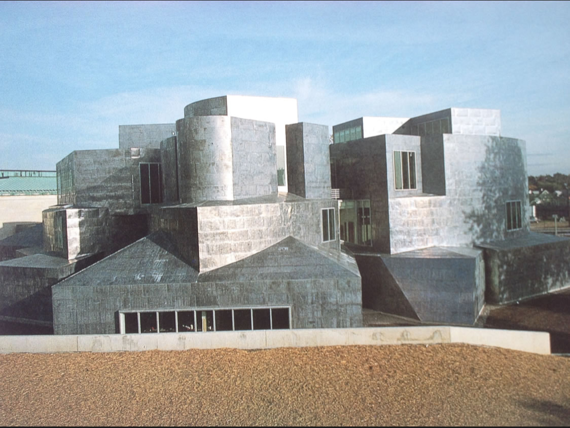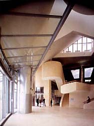 Opera di apertura di un nuovo ciclo. Le traiettorie nello spazio, la capacità di sagomare masse sinuose e dinamiche che rimbombano nell'aria e deformano l'atmosfera, le linee forze e le collisioni ricordano la plastica futurista. È architettura o scultura? Domande irrilevanti per Gehry, cui aveva già risposto Boccioni. "Nessuna paura è più stupida di quella che ci fa temere di uscire dall'arte che esercitiamo. Non v'è pittura, né scultura, né musica, né poesia, non v'è che creazione." Come dimostrano qui gli smaglianti interni.
