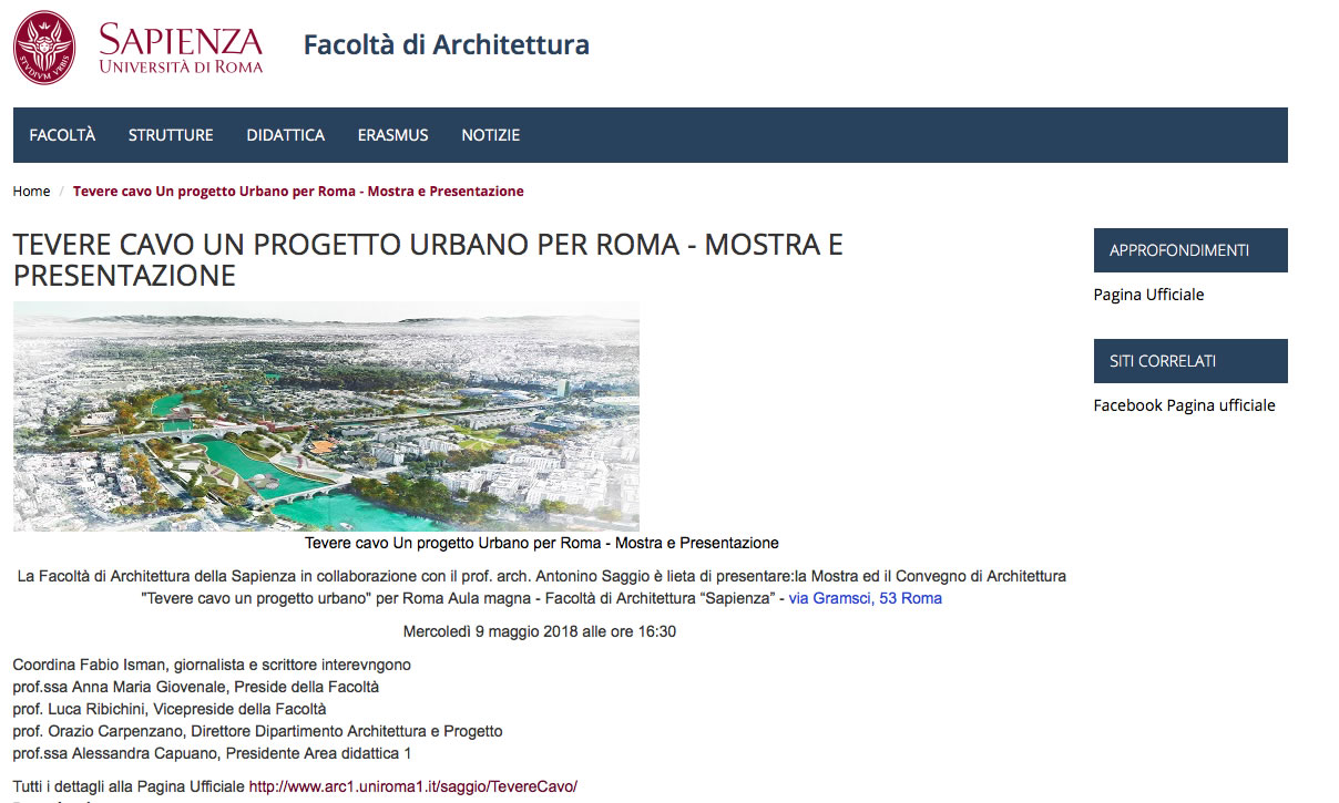Dal Marzo 2012 la Cattedra di Antonino Saggio alla Facoltà di Architettura di "Sapienza" Università di Roma ha lavorato alla grande proposta denominata Tevere cavo. Si tratta di un progetto urbano che ha visto coinvolti circa trecento tra dottorandi, laureandi e giovani studenti-architetti e che intende mettere a sistema una serie di vuoti urbani e di aree sottoutilizzate a Roma. Si tratta in particolare della parte della città che segue l’andamento del Tevere dalla diga di Castel Giubileo alla porta di Piazza del Popolo e che è racchiuso dai grandi colli di Monte Mario ad ovest e di Monte Antenne ad est. Il progetto Tevere Cavo si ricollega alla Urban Green Line che creava un anello ecologico tra i due grandi parchi archeologici tra l’Appia e la Casilina. Se in quel caso una nuova linea tranviaria assumeva il ruolo di catalizzatore di una serie di intenti e scopi, in questa parte di Roma non può essere che il Tevere l’elemento sistemico. Un Tevere su cui scorre la storia stessa della città e forse il suo futuro. Oltre alla Pagina Ufficiale Tevere Cavo, strumenti fondamentali del progetto sono il Blog Tevere Cavo e la Mappa Google Tevere Cavo Progetto Urbano della Cattedra di Antonino Saggio