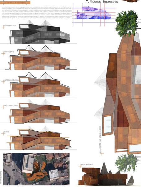 F3. Iniziare a fare a vostra scelta una serie di disegni inziando dalla caratteristica che secondo voi è più importante del progetto. per esempio Silhouette? o Chiaroscuro? o. Attacco al suolo? o Attacco al cielo o Ritmo? Per "vedere" il progetto è utile ovviamente a volte guardare il modello 3d se lo avete nel computer o ancora meglio il plastico se lo avete cominciato a fare. Adesso in qualche modo "interrogato2 il plastico più che dal punto di vista spaziale..da quello espressivo!