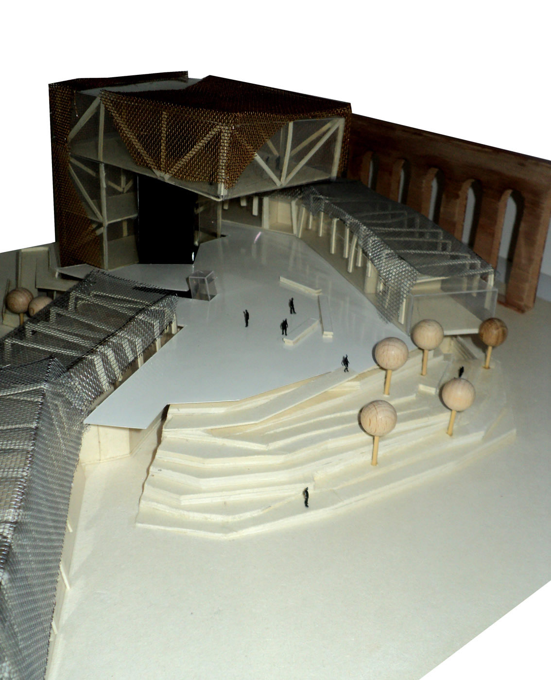 Un percorso ascensionale parte dallo spazio oscuro del sotterraneo e dei parcheggi, si innesta verso uno spazio più luminoso, incontra una piazza e poi sale progressivamente in un volume monolitico (occupato dalla scuola di danza) per arrivare al grande spazio in potente aggetto dell’ultimo piano che è la sala di prova più importante. Da qui si ha una vista a 360 gradi sulla città e sui suoi flussi dinamici: gli acquedotti, la ferrovia, la tangenziale, la Porta maggiore. Il grande monolite perfora il terreno e si articola in un volume ad “L”. Attorno a questo elemento si incastrano le altri componenti del progetto che si collocano a quote diverse e che sono raggiungibili tramite una serie di rampe. Si tratta di un sistema che rende agevole l'accessibilità alle varie parti dell'intero complesso progettuale, lo collega all’esternoi n varie direttrici e determina una dialettica tra una architettura di "suolo" alla base e una più icastica in elevazione.